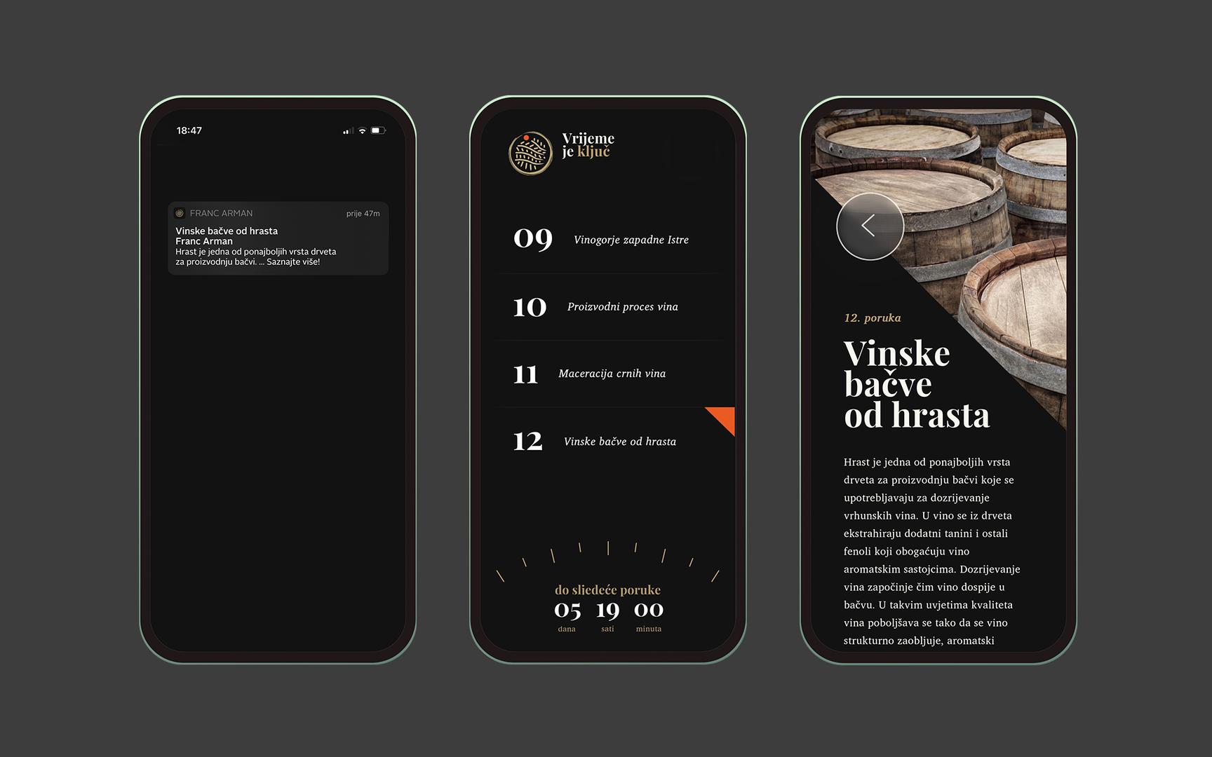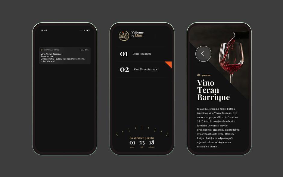 Žiri svjetske klase sastavljen od 120 stručnjaka u kreativnoj industriji nagradio je broncom rješenje boce zaključane u kutiju i nedostupne za otvaranje do vremena sazrijevanja. Bocu prati aplikacija koja putem QR koda s kutije tijekom duljeg perioda šalje vlasniku boce poruke koje ga educiraju o povijesti enologije i ljepoti vinarstva, a u za to predviđeno vrijeme i šifru za otvaranje vina s porukom “Vrijeme je za tvoje vrijeme”.