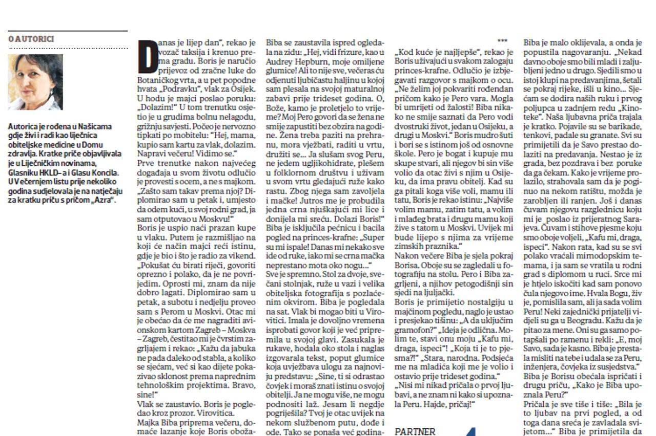 „Pa lakše malo, niste sami u autobusu!“ Ništa joj ne odgovorim, fokusirana sam na sjedalo do sebe. Moj se susjed trgne, instinktivno podigne ruke, onako kako to rade ljudi kad ih se naglo probudi, kao da se brani od nečega. Dok sam se dizala sa sjedala, iz krila mi je ispala futrola za naočale i zaustavila se pred njegovom lijevom tenisicom. On se saginje u namjeri da je dohvati, no ja ga brže-bolje preduhitrim i zabacim nogu svom dužinom ispred njegovih koljena, grubo ga pritišćući. Vrhom cipele jedva dohvatim futrolu i doguram je ispred sebe. On je zbunjen, smješka se, nešto bi možda i rekao.