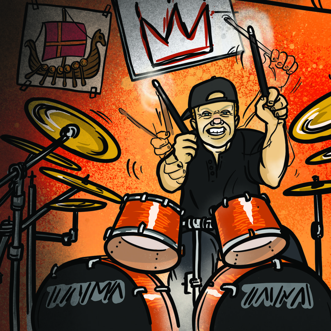 Upoznajemo i svakog od članova benda. Slovo C je rezervirano za Cliffa Burtona, bivšeg bas-gitarista zvanog “Major Rager”. Svirkom bi hipnotizirao publiku, od glave do pete odjeven u traper, a zaštitni znak bila mu je crvena griva kojom je silovito mlatio dok bi svirao. Ime mu je upisano uz najveće glazbenike povijesti glazbe. Uz J je James Hetfield, vokal, gitarist i osnivač benda. Na ilustraciji je u starom automobilu što nam otkriva njegov hobi – kolekcionarstvo. James, naime, skuplja i obnavlja stare modele automobila poput Zephyra, Roadstera i Packarda... Njegov metal je očito žestok, bilo da je u pitanju glazba ili stroj. U oba slučaja vrijedi što glasnije, što brže.