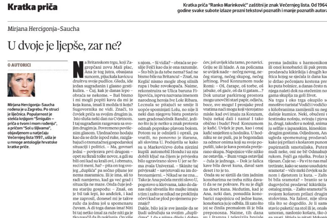 Kratka priča “Ranko Marinković” zaštitni je znak Večernjeg lista. Od 1964. godine svake subote izlaze prozni tekstovi poznatih i manje poznatih autora
