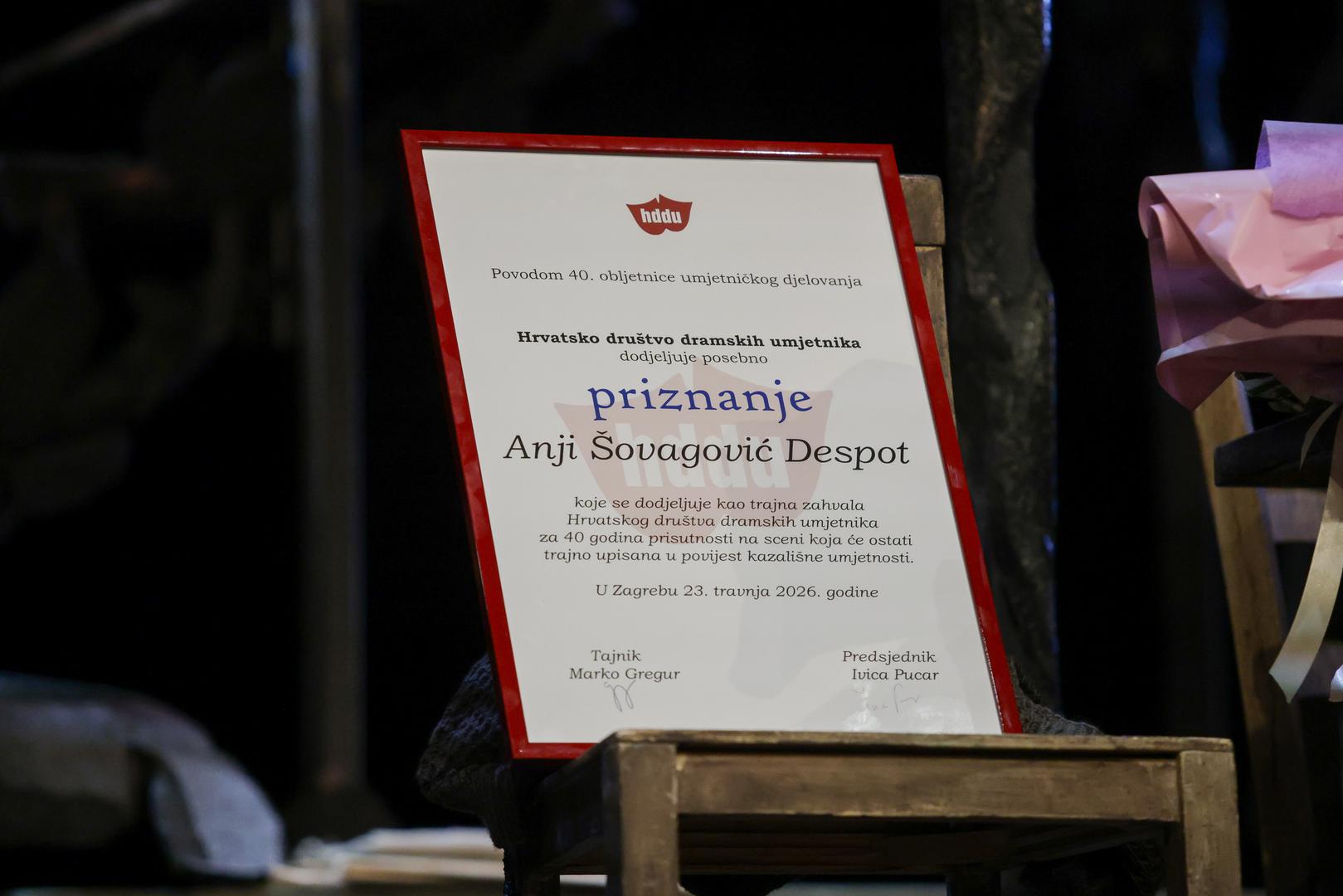 "Glumac i publika čine taj čarobni spoj koji se na kraju zove kazalište", kazala je glumica zahvalivši publici i ansamblu. Također je zahvalila ljudima iza scene te naglasila njihovu važnost u kazalištu