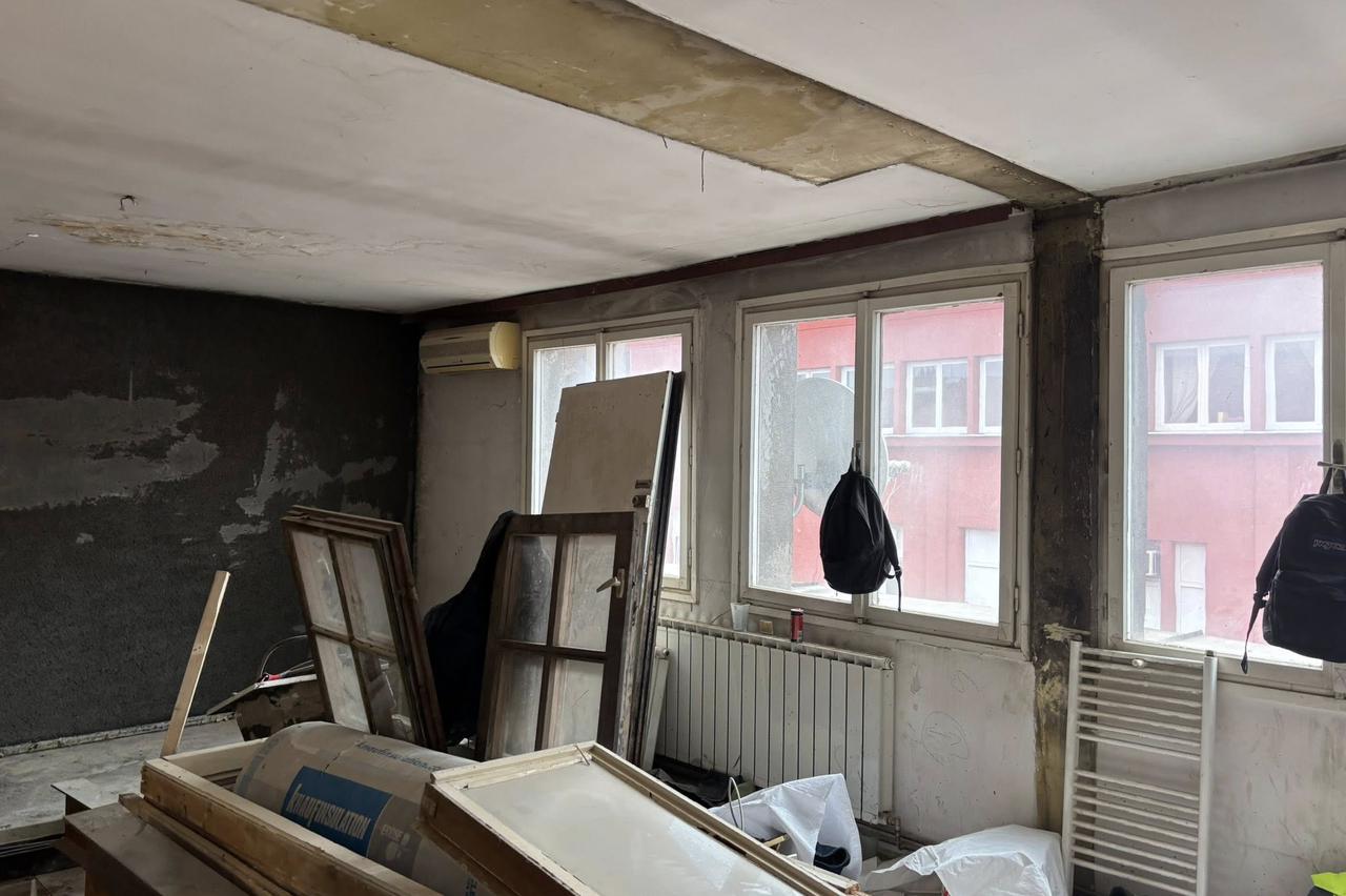 Atelje se nalazi na zadnjem katu zgrade, upravo su zadnji kat i krov bilo najoštečeniji. Projekt obnove, međutim, nije uključio obnovu krova. U stanu ispod mene sanirali su vlagu na plafonu, kod mene plafone nisu niti taknuli. Pregradni zid činila je drvena stijena posebno projektirana za taj stan 60-ih godina, radilo se o vrlo specifičnom dizajnu koji je pod svaku cijenu trebalo sačuvati. Ni taj pregradni zid nije ušao u projekt i sada će ga biti nemoguće vratiti jer je podignut nivo poda, na što nisam bila upozorena.