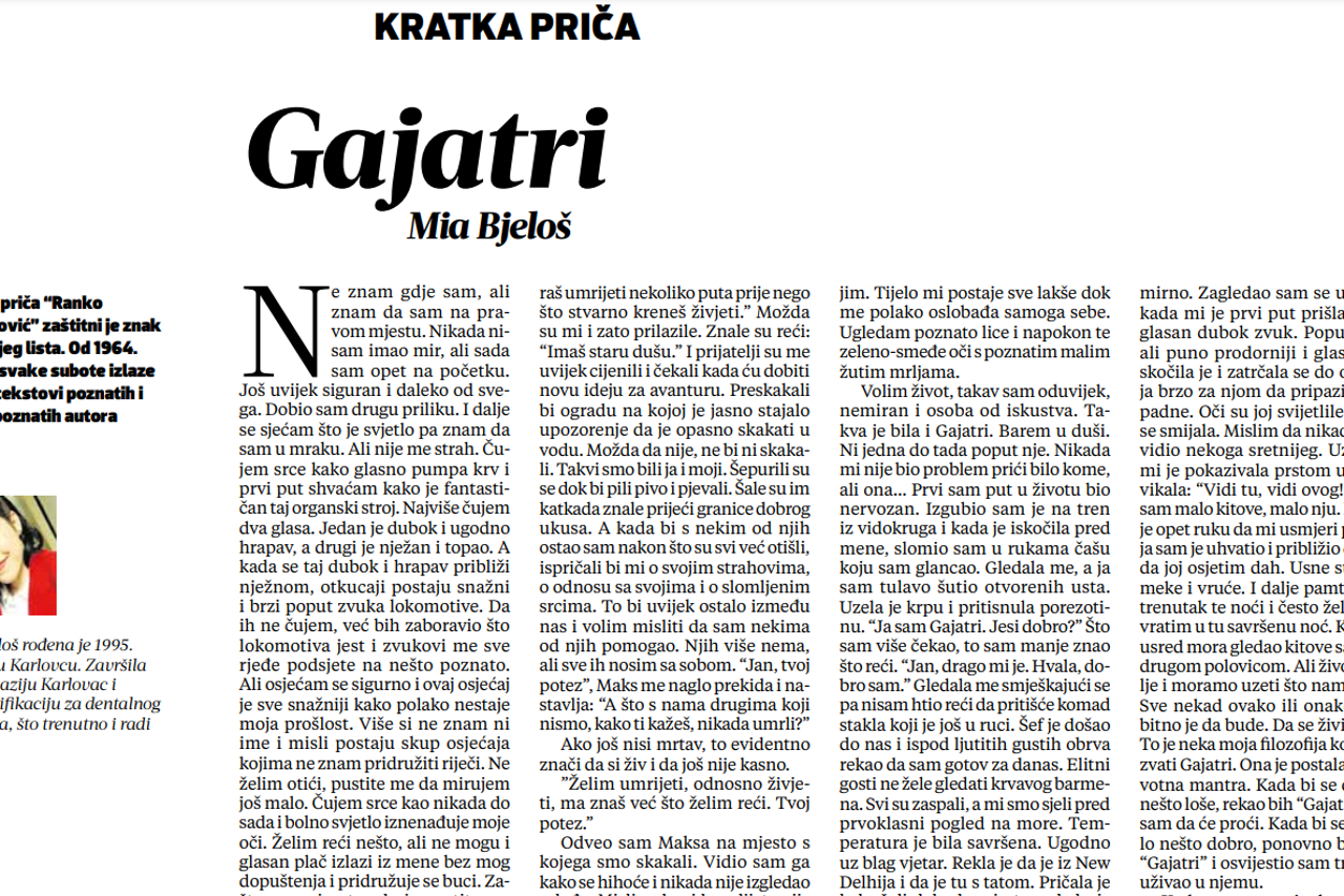 Skakali smo s tračanja gostiju do tema kao što su smisao života i što dolazi poslije. Pričala je kako oni vjeruju u reinkarnaciju, a kad god bih rekao nešto u želji da se pokažem pametnim, našalila bi se: "Nije tebi ovo prvi život." Proveli smo zajedno mjesec dana. Ali znao sam je i ona je znala mene. Instantna bliskost i svaku sam ljubavnu pjesmu nakon toga slušao drukčije. Preko dana bismo se zabavljali i igrali kao djeca, a kako je mrak padao, tako su nam i teme postajale dublje. Pričala mi je priče iz Bhagavad Gite, a ja njoj o svim svojim poslovima, putovanjima i okusima mesnih obroka. Onda se dogodilo. Zadnju noć. More je bilo mirno. Zagledao sam se u nju kao kada mi je prvi put prišla. Čuo se glasan dubok zvuk. Poput jelena, ali puno prodorniji i glasniji. Poskočila je i zatrčala se do ograde, a ja brzo za njom da pripazim da ne padne. Oči su joj svijetlile i glasno se smijala. Mislim da nikada nisam vidio nekoga sretnijeg. Uzbuđeno mi je pokazivala prstom u kitove i vikala: "Vidi tu, vidi ovog!" Gledao sam malo kitove, malo nju. Ispružila je opet ruku da mi usmjeri pogled, a ja sam je uhvatio i približio dovoljno da joj osjetim dah. Usne su joj bile meke i vruće. I dalje pamtim svaki trenutak te noći i često želim da se vratim u tu savršenu noć. Kada sam usred mora gledao kitove sa svojom drugom polovicom. Ali život ide dalje i moramo uzeti što nam je dano. Sve nekad ovako ili onako završi, bitno je da bude. Da se živi i doživi. To je neka moja filozofija koju volim zvati Gajatri. Ona je postala moja životna mantra. Kada bi se dogodilo nešto loše, rekao bih "Gajatri" i znao sam da će proći. Kada bi se dogodilo nešto dobro, ponovno bih rekao "Gajatri" i osvijestio sam trenutak i uživao u njemu.