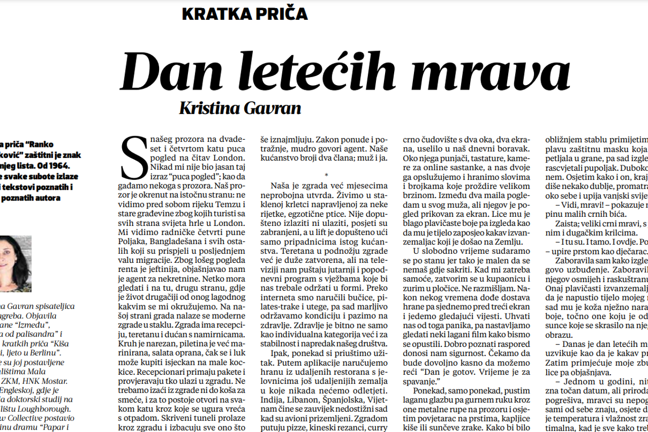 Odveo sam Maksa na mjesto s kojega smo skakali. Vidio sam ga kako se hihoće i nikada nije izgledao mlađe. Mislim da ni kao dijete nije izgledao mlado. Barem ga ja tako zamišljam. Kao tinejdžeri zatrčavamo se do ograde izgrizene hrđom, dolazimo tik do nje, usporavamo, stajemo i oprezno prebacujemo jednu po jednu nogu. Dolazimo do ruba i odgađamo skok uživajući u trenutku i suncu koje nam prži lica. Prije nego što je Maks stigao izreći riječi premišljanja, uzimam zamah i polijećem. "Tvoj potez, Maks!" vičem dok se spremam na zaron. Hladna voda budi svaki dio mene i osjećam ushit. Odvojen od cijelog svijeta tom tankom granicom zraka i vode. Duboko sam. Ne znam gdje je dolje, a gdje gore. Tlak vode grli moje iživljeno srce i čujem zvuk Maksova udarca o vodu. Zadovoljan time, zatvaram oči. Mrak je, ali se ne bojim. Tijelo mi postaje sve lakše dok me polako oslobađa samoga sebe. Ugledam poznato lice i napokon te zeleno-smeđe oči s poznatim malim žutim mrljama.