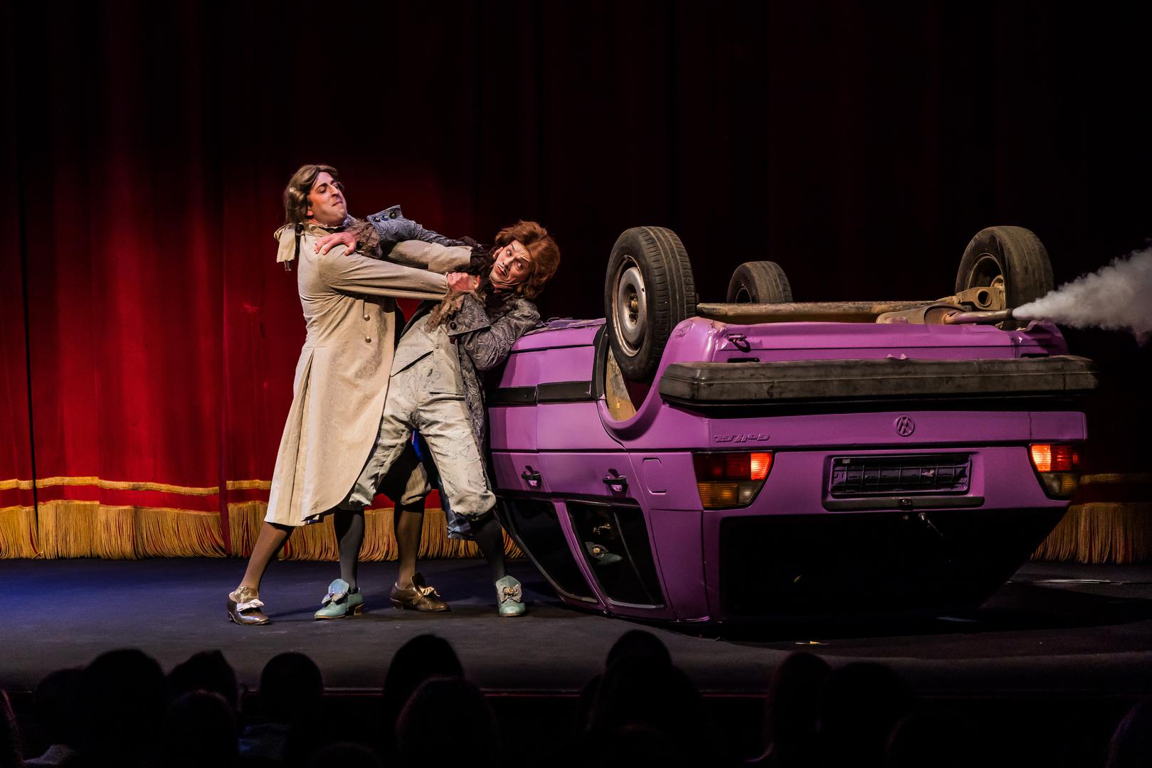 Redatelj Miloš lolić koji potpisuje i scenografiju i izbor glazbe i scenski pokret, iskoristio je samo mali dio velike kazališne pozornice. Predstava se odvija ispred zastora, "jedina" scenografija je pink automobil okrenut na krov iz kojeg izlaze glumci. U nekoliko navrata iz auspuha je pušten gusti bijeli dim pa su gledatelji u prvim redovima imali dojam da "su na Poljudu". Protagonisti su ispaljivali blještave konfete. Poveznica s aktualnim trenutkom, današnjim svijetom u kojem su prave vrijednosti totalno izokrenute?!