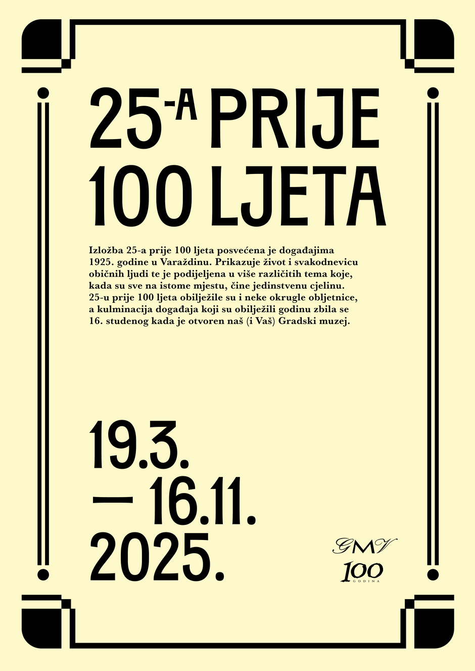 „Središnji cilj i tema izložbe je posjetiteljima dočarati osnivanje muzeja, što će biti ilustrirano kroz izložene fotografije nastale upravo 16. studenog 1925. godine, kao i predmete iz originalne muzejske postave. Valja naglasiti da je 1925. bila obljetnička godina koja je i u kulturnom smislu ostavila traga u povijesti grada Varaždina. Stoga će se u sklopu izložbe prikazati i događaji koji su obilježavali živote Varaždinaca, poput 175. godišnjice Varaždinske građanske čete, 1000. obljetnice Hrvatskog kraljevstva, 50. obljetnice Hrvatskog pjevačkog društva Vila te izbora za varaždinsko Gradsko zastupstvo.“ istaknuo je ravnatelj Gradskog muzeja Varaždin, Miran Bojanić Morandini.