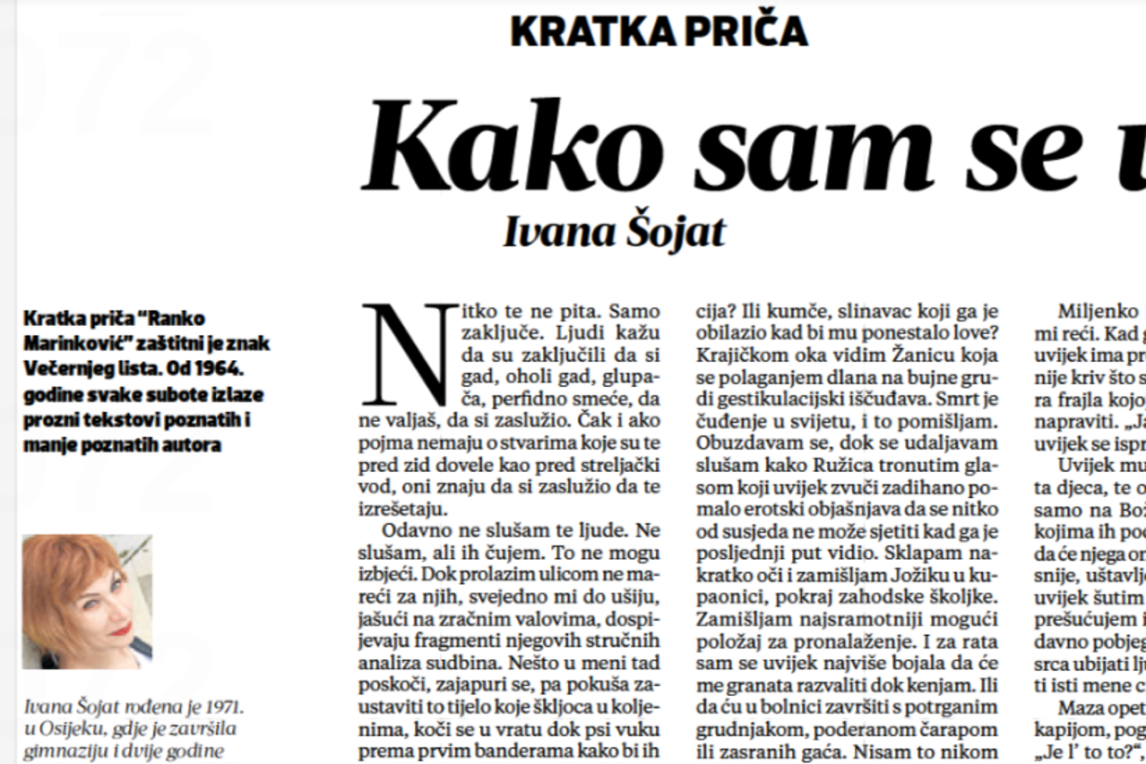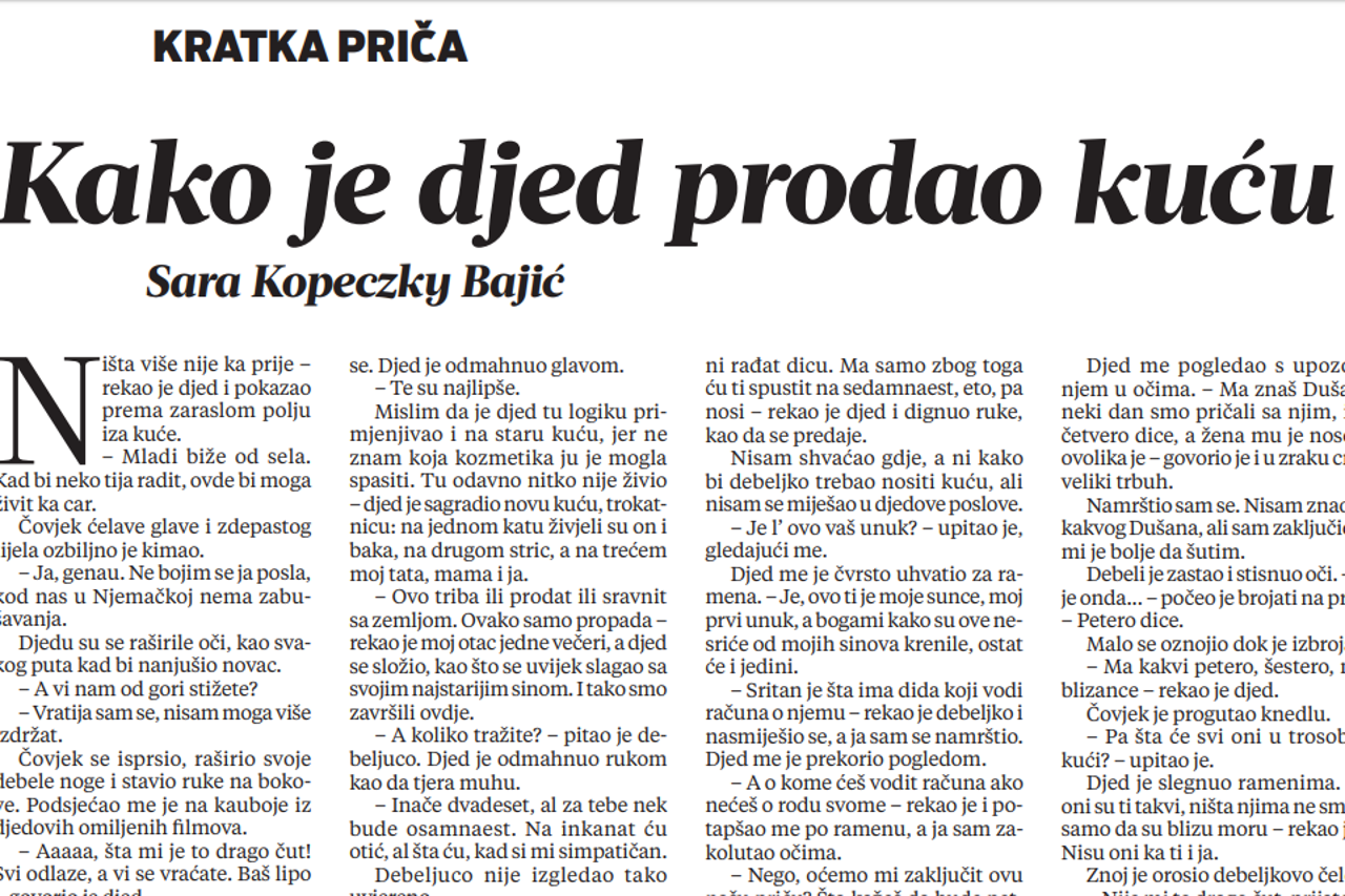 – Ja klar, nema do domaje. Nego, recite mi, iz koje je godine kuća? – upitao je i približio se ispucaloj fasadi, što mu je po mom mišljenju bilo glupo, jer je dobro izgledala jedino s pristojne udaljenosti. Djed ga je užurbano pratio. Čovjekovo čelo nabralo se dok je promatrao trošnu kuću, slično kao što se nabrala boja zidova pod utjecajem vlage.