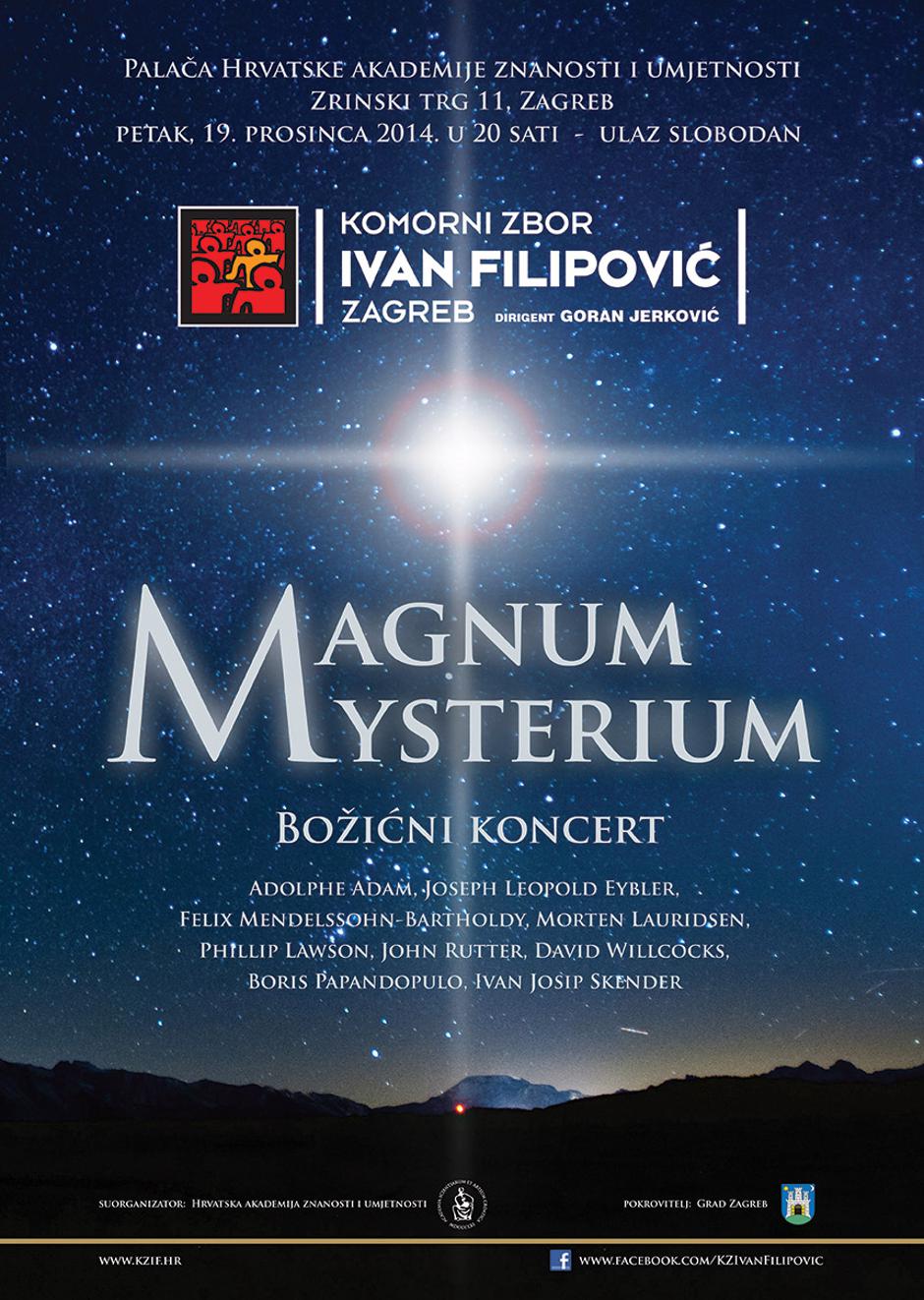Komorni zbor "Ivan Filipović" poziva sve ljubitelje zborskog pjevanja na svečani božićni koncert MAGNUM MYSTERIUM, koji će se održati u petak 19. prosinca, s početkom u 20 sati, u palači Hrvatske akademije znanosti i umjetnosti. Tematski je ovaj koncertni program u potpunosti posvećen vremenu pripreme i dolazećih blagdana - Advent, Božić, Bogojavljanje (Sv. Tri Kralja).