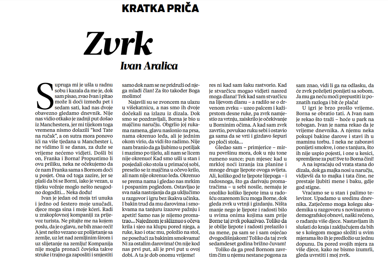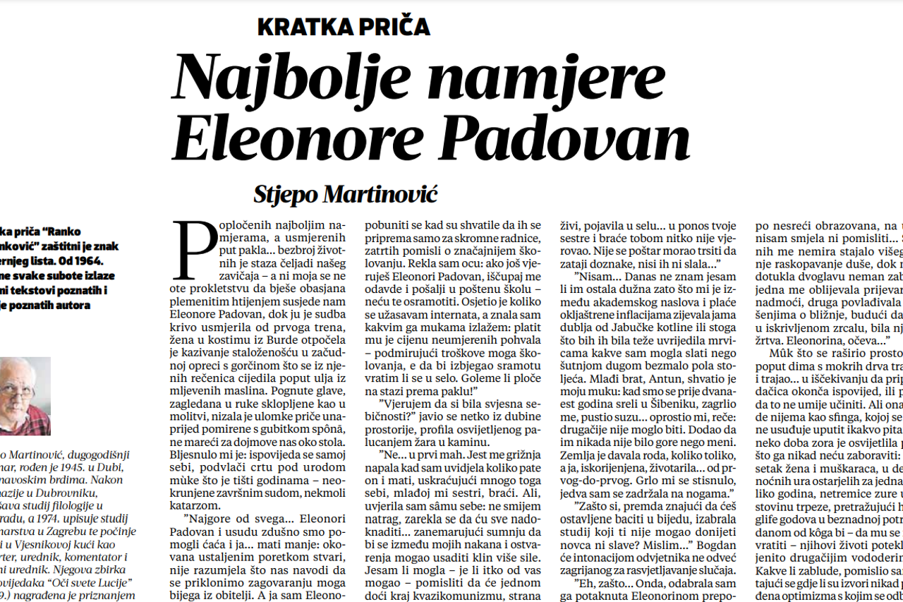 Na toliko pitanja samo je jedan odgovor. Izgovara broj mobitela svojih najbližih i plače. Kakav svršetak dana koji je još jutros obećavao ljepotu. Dok se penjala stazom obraslom u nisko raslinje dalmatinskog krajolika prema crkvici sv. Ante, sunce je grijalo. Sve oko nje bilo je uzavrelo. Bodljikave, suhe grančice peckale su joj bose noge. Zaglušujući pjev zrikavaca najavljivao je vruć dan jer uskoro je Sveti Ilija. Znoj se slijevao niz čelo, a pramen kose natopljen znojem zaklanjao joj je pogled. Oči su je pekle pa je kapke napola spustila pokušavajući procijeniti koliko joj treba do cilja. Mjesno groblje na kojemu leže njeni preci danas je obavijeno maglicom satkanom od sparušenog zelenila, mirisa suhe zemlje i užarenoga kamena pod vrelinom sunca. Omamljena tim mirisima i zvukovima zrikavaca, bumbara i muha, sve jače je čula svoje ubrzano disanje i srce kako bubnja u grudima. Omara je, poput nadgrobne ploče, sjela na njena ramena, crvena od sunca i mokra od znoja. Zadnjim se snagama pokušavala popeti do čempresa po malo hlada. Lice joj gori, a u glavi muklo odjekuju tupi udarci... Napokon je na cilju. Stoji u hladu čempresa dok vjetrić raznosi miris njena znojnog tijela i polagano je hladi. Odjednom začuje zvuk zvona i pogledom potraži odakle dolazi. Ugleda ovna predvodnika stada ovčica koje se razlijevalo po nadgrobnim pločama poput valova zapjenjenog mora pod jugom. Usput prosipaju kuglice svoje nutrine jer njima ništa nije sveto. Njihov meket razbio je tišinu ovoga svetog mjesta i ljetna omara sad vonja poput prolivenog mlijeka koje neugodno draži nosnice. Dok smiruje svoje pregrijano tijelo, Iva pogledom prikuplja obrise krajolika u cjelovitu sliku. U daljini se prelijevaju zeleno-plavi vinogradi i maslinici, a na drugoj strani morska se pučina stapa s plavetnilom neba. Tračak ljepote u surovom, škrtom podneblju. Mobitelom snima taj trenutak za pamćenje ili za Instagram. Doživljaji s ljetovanja koje želi podijeliti. Najednom iz daljine dopire mukli tutanj. Što je to, jer ratni su vihori prohujali ovim krajevima davnih godina. Polako se brišu sjećanja i na ovaj posljednji. I dok traži odgovor, munja zapara nebo i oblak na trenutak prekrije sunce.
