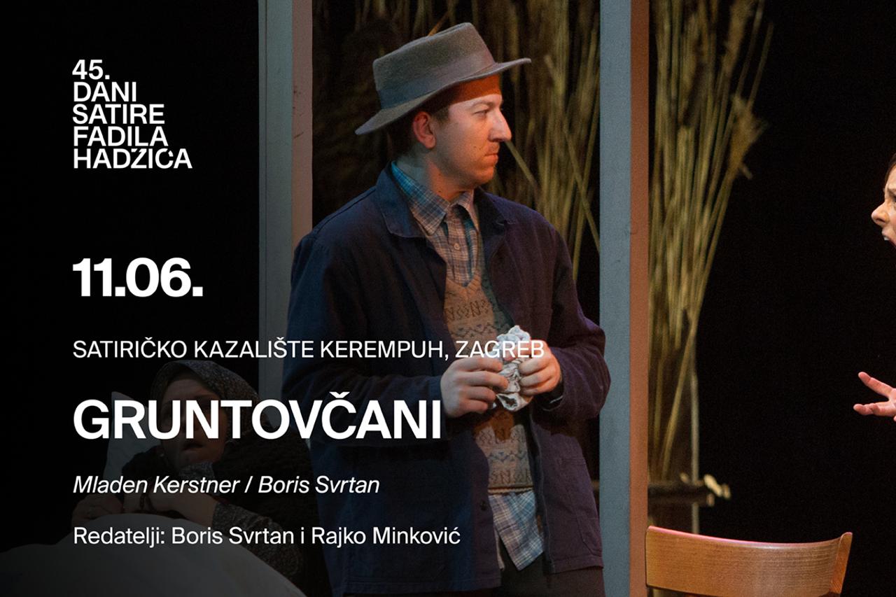 Gruntovčani su istovremeno i posveta jednoj od najboljih hrvatskih serija svih vremena, ali i punokrvna, suvremena satira društva koje se nije riješilo boljki prošlosti, nego ih je samo odjenulo u novo ruho. Adaptacija Borisa Svrtana, koja nadopisuje Kerstnerov dramski tekst, Gruntovčane pretvara u naše suvremenike. Dudek, Regica, Presvetli, Martin, Cinober, Matula, Babica, Besni, Gretica i ostali i dalje žive u svom mirnom Gruntovcu, no izazovi s kojima se susreću pripadaju našem vremenu, vremenu surovog kapitalizma koji će poremetiti mirnoću njihova seoskog života i izvući na vidjelo pohlepu, lukavost, licemjerje i bezdušnost suvremenog doba. Državna tajnica Marina Puvalo koja u Gruntovec dolazi s idejom o gradnji spojnice na europski koridor i velike tvornice koja bi navodno trebala mnogima osigurati poslove, unijet će u živote Gruntovčana nemir i otvoriti vrata različitim spletkama u kojima Dudek kao predstavnik dobrodušnog, naivnog, ali čistog čovjeka ostaje sam na vjetrometini političkih manipulacija i osobnih interesa, ismijan zbog svojeg idealizma i dobrote.