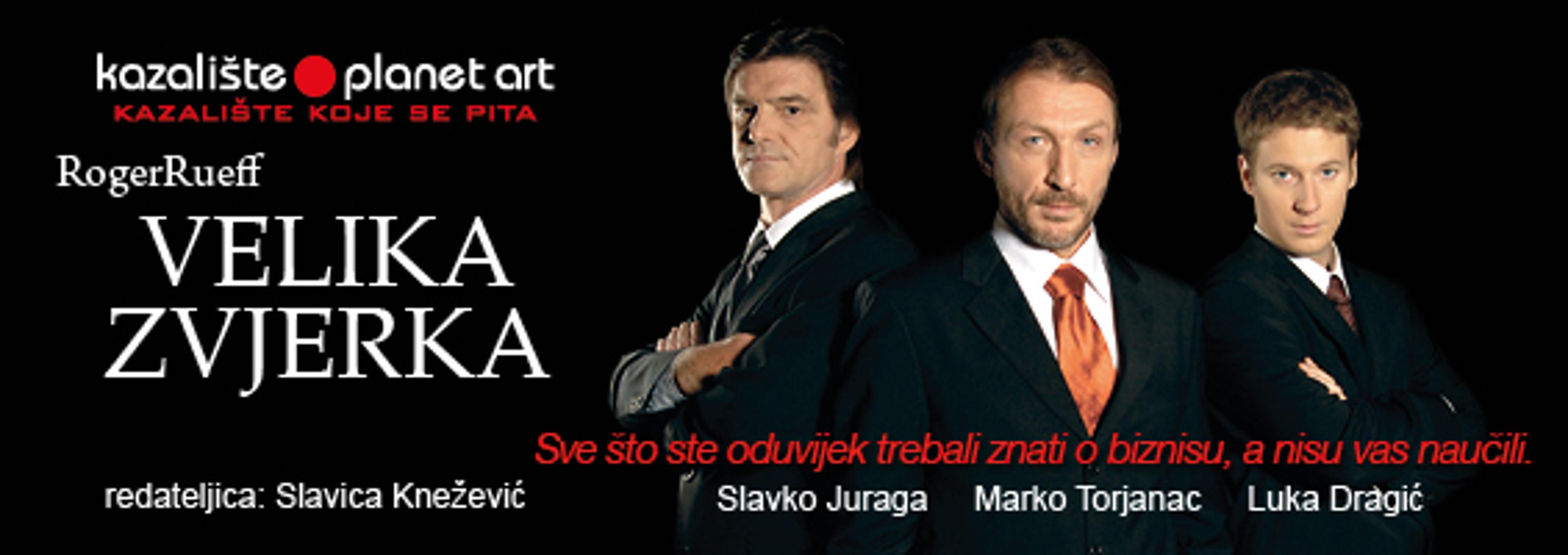 Zadnja predstava u veljači je već kultna Velika Zvjerka u subotu 24.2., također u Kazalištu Mala scena, koja nas s puno humora vodi u svijet današnjeg biznisa postavljajući nam pitanja o egistenciji koja nas se danas itekako tiče. U ovoj predstavi, koja je do sada izvedena više od 150 puta, igraju Slavko Juraga, Marko Torjanac i Luka Dragić, a predstavu je režirala Slavica Knežević.