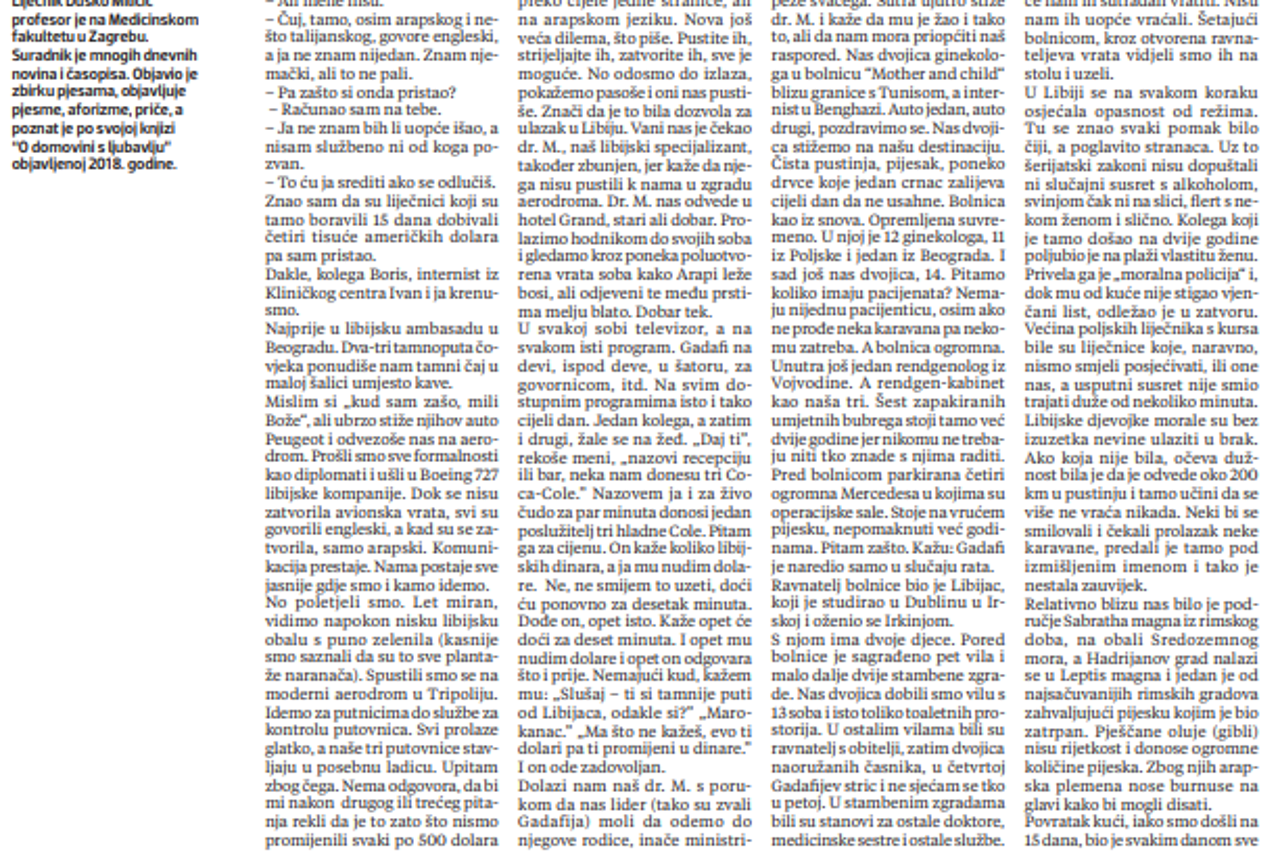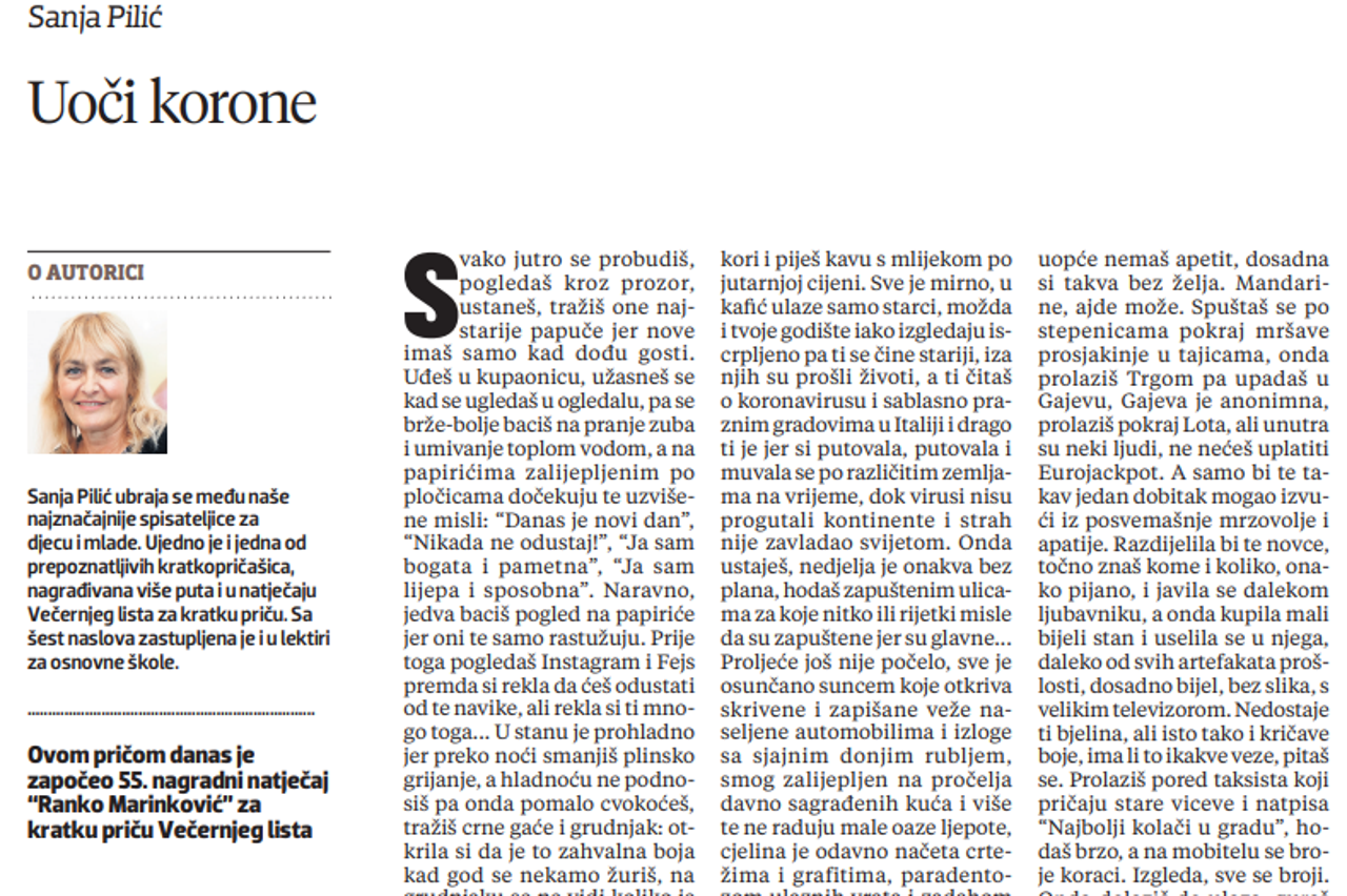 Pogledala je na mobitel. Marko se nije javio iako mu je radno vrijeme odavno završilo. Nije željela razmišljati gdje je. Kakvo dobro bi joj to donijelo? Kako je drugima, ne mogu se žalit. Ustala je i počela peglati njegove košulje. Nije ga mogla pustiti da u svijet ide izgužvan. Što bi ljudi rekli? U glavi su joj odzvanjale majčine riječi: Lako je s nekim samo živit. Triba s njim i umrit. Ponekad joj se umiranje ipak činilo lakšim.