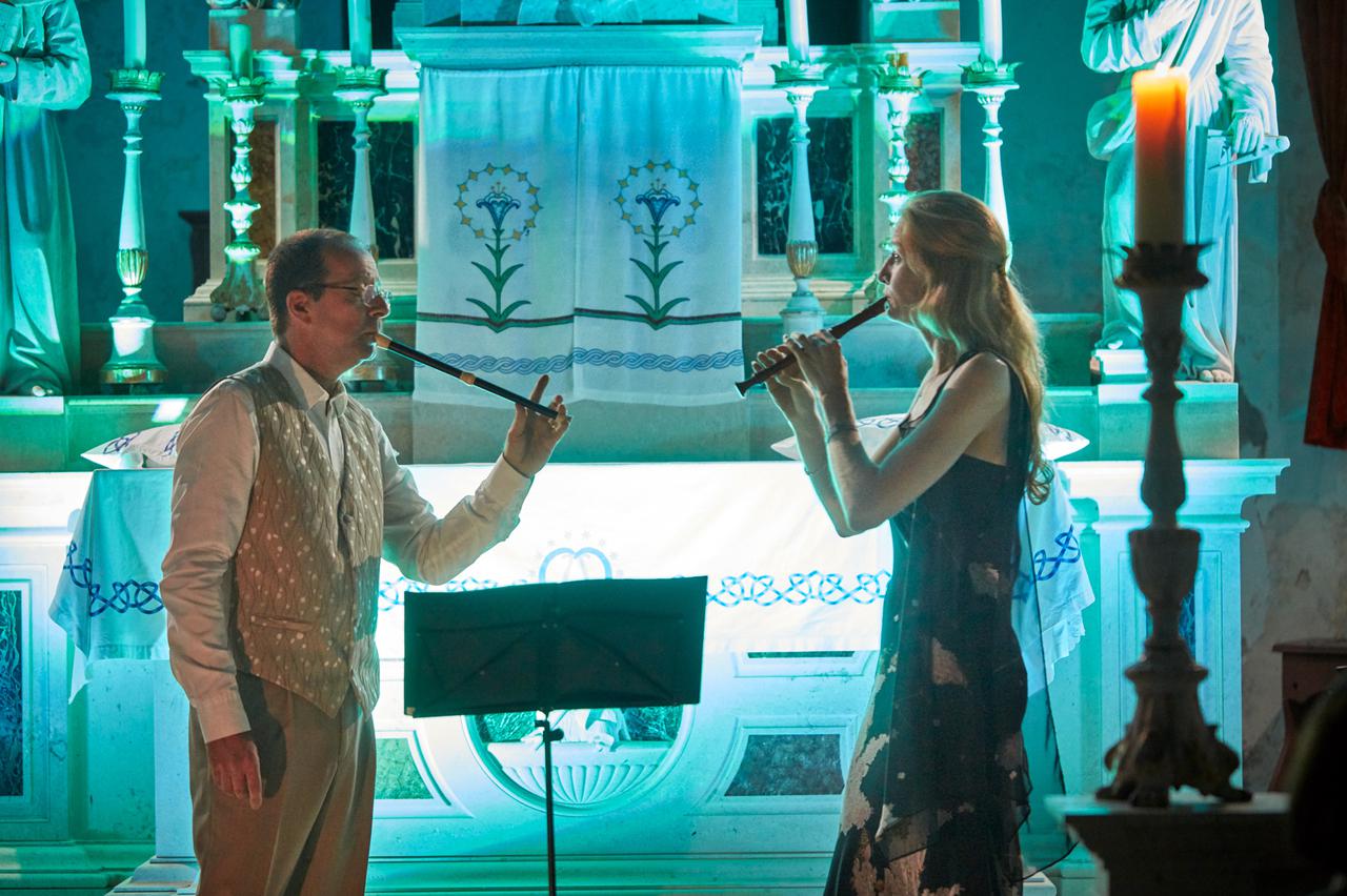 Za glazbenu kupku pobrinule su se violinistice Laura Vadjon, Tanja Tortić, Helga Korbar i Saša Borčić Reba u programu prikladno nazvanom "Raspjevane violine" s tri Koncerta za četiri violine solo (u G- duru, C-duru i D-duru) Georga Philippa Telemanna kao okosnicom. Publika je u crkvi disciplinirano sjedila s maskama, no jednako se u koncertu moglo uživati i izvana, kroz rastvorena vrata i prozore crkve.