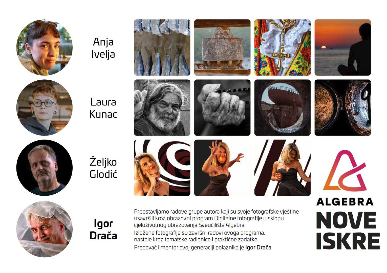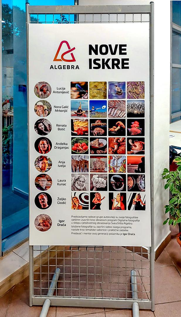 U galeriji Gradske knjižnice Marka Marulića u Splitu, u povodu Svjetskog dana fotografije, otvorena je 20. kolovoza izložba Nove Iskre, grupe autora koji su svoje fotografske vještine usavršili kroz obrazovni program Digitalne fotografije u sklopu cjeloživotnog obrazovanja Sveučilišta Algebra. Izloženi su završni radovi ovog programa, nastali kroz tematske radionice i praktične zadatke. Predavač i mentor ovoj generaciji polaznika je Igor Drača. Izložba se može pogledati od 20. do 31. kolovoza 2024.