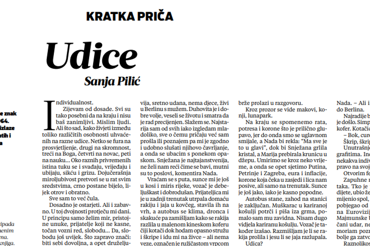Sjedim u autobusu za stolom, okružena trima ženama. Nada, Snježana i Marija. Vraćam se odnekud, malo umorna, jer umorni junaci su uvijek bolji za priču, ha-ha… (Ne smijem se hvaliti kad pišem u prvom licu jednine, samokritika se više cijeni. Šteta. A prvo lice jednine prosječni čitatelj uvijek doživljava kao autobiografski zapis.)