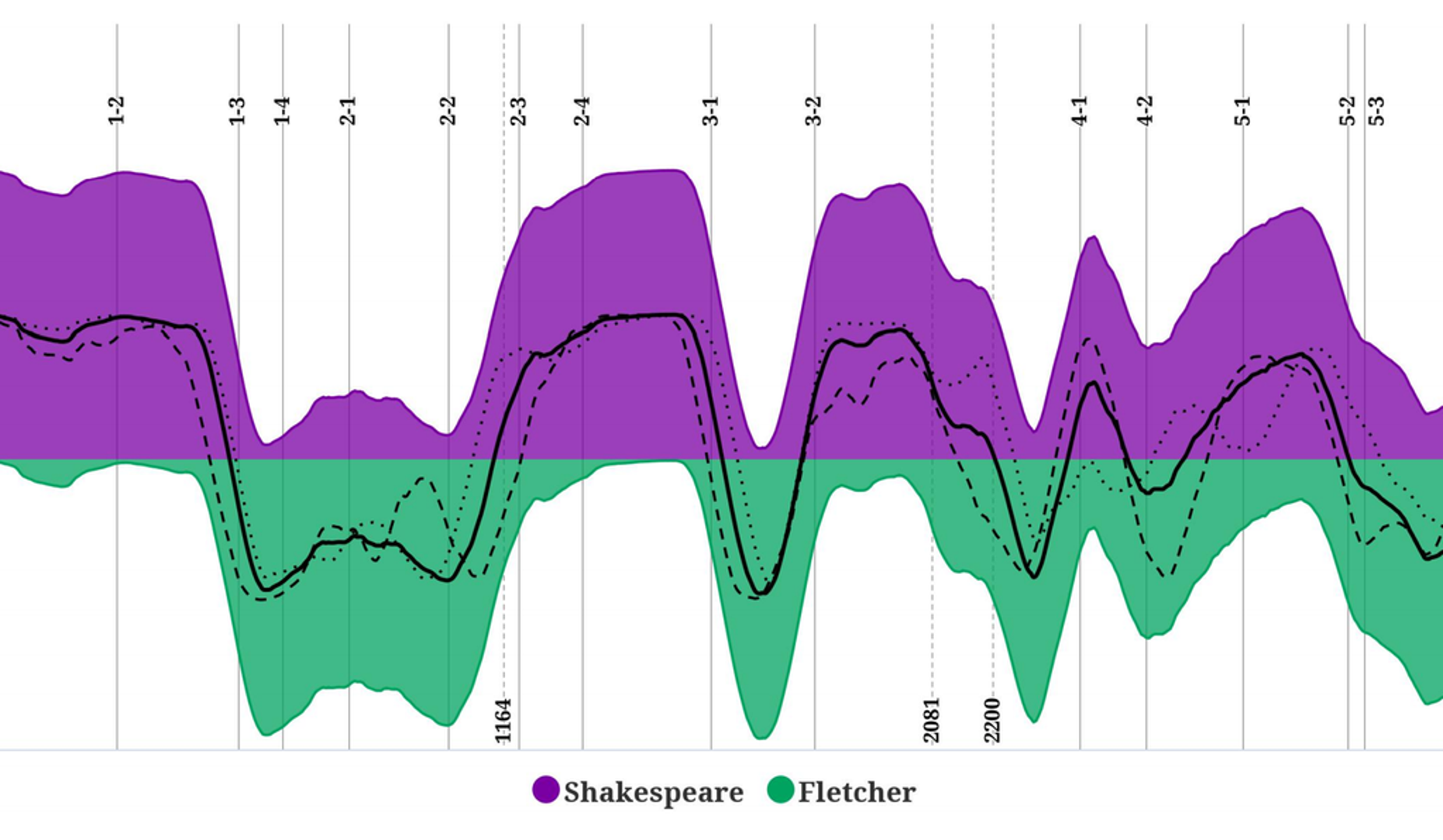 Grafikon koji je objavio Plecháč pokazuje da je Shakespeare napisao prve dvije scene, a Fletcher iduće četiri, no negdje oko 2081. retka, analiza pokazuje da su oba pisca podjednako sudjelovala u pisanju scena sve do 2200. retka od kojeg dominira Shakespeare.