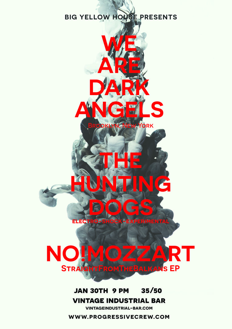 Koncert sastava NO!Mozzart, The Hunting Dogs i We Are Dark Angels organiziraju umjetnička kuća Big Yellow House i Progressivecrew.com. Koncert počinje u 21 sati. Ulaznice su u prodaji po pretprodajnoj cijeni od 35 kn, a na dan koncerta cijena ulaznice iznosit će 50 kn. Ulaznice je moguće kupiti na blagajni Vintage Industrial Bara.