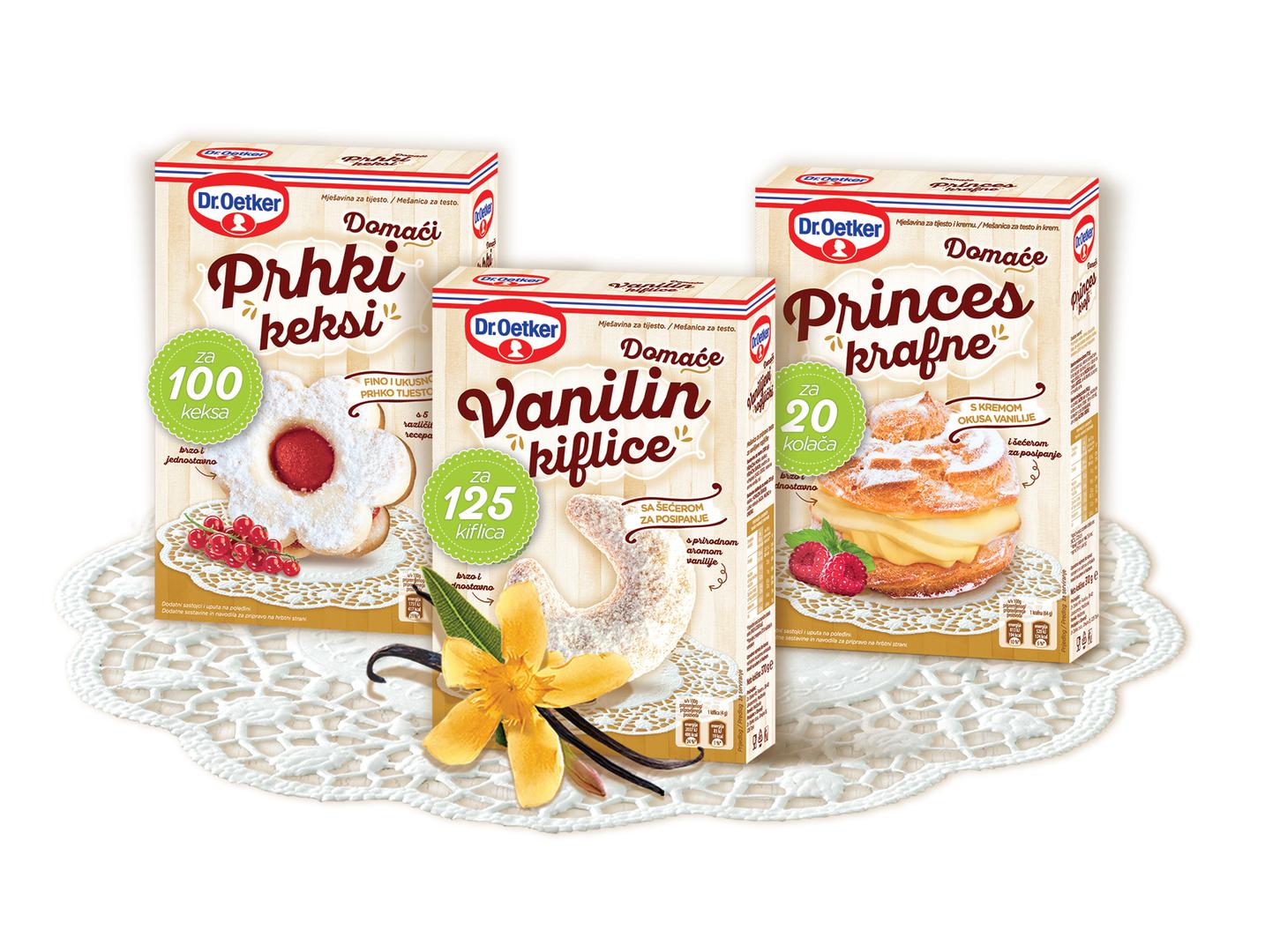 Za sve ljubitelje domaćih kolača Dr. Oetker predstavio je novi asortiman s tri tradicionalne i iznimno popularne recepture u Hrvatskoj – Vanilin kiflice, Prhki keksi i Princes krafne. Dr. Oetker mješavina za tijesto Vanilin kiflice s prirodnom aromom vanilije dovoljna je za pripremu čak 125 kiflica, a kako bi svaki zalogaj bio još slađi, u pakiranju se nalazi i šećer za posipanje. Fino i ukusno prhko tijesto u svima će probuditi osjećaj nostalgije te će svatko brzo i jednostavno moći pripremiti tradicionalne kekse uz recepte priložene u pakiranju. Svima omiljene Dr. Oetker Princes krafne osvajaju neodoljivom kremom s okusom vanilije i sočnim tijestom, uz dodatak šećera za posipanje koji dolazi u pakiranju, čine savršenu kombinaciju kremastog užitka.
