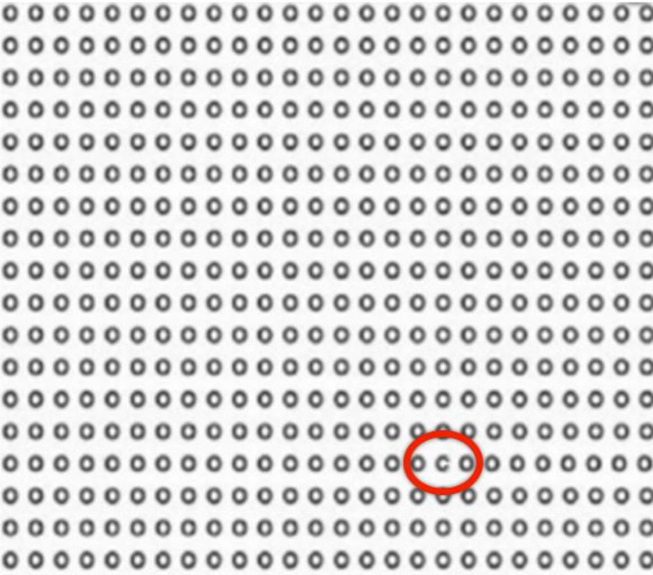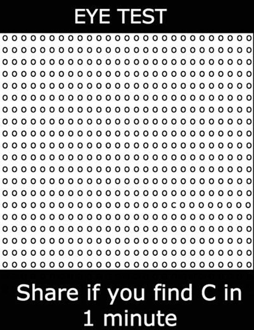 Jedan vizualni test izazvao je ljude diljem Interneta da u moru slova 'o' nađu samo jedno 'c'. Izazov je bio pronaći slovo 'c' u sedam sekundi, međutim 99% ljudi koji su se okušali u izazovu ne mogu ga pronaći. Upozorava se i da ne zurite predugo, jer bi vam ova križaljka mogla prouzročiti glavobolju.
