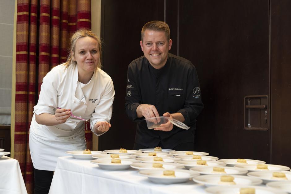 Gala večeru za uzvanike u Smaragdnoj dvorani pripremali su chefovi Ana Grgić Tomić i Stefan Heilemann, chef Widder Restaurant Zurich, nagrađen s 2 Michelin** i 4 toke Gault&Millau, a proglašen je i Gault&Millau chefom godine u Švicarskoj 2021. Uz šest sljedova njihovih delicija posluživana su vrhunska vina iz vinarija Laguna, Belje, Krauthaker i Veralda.