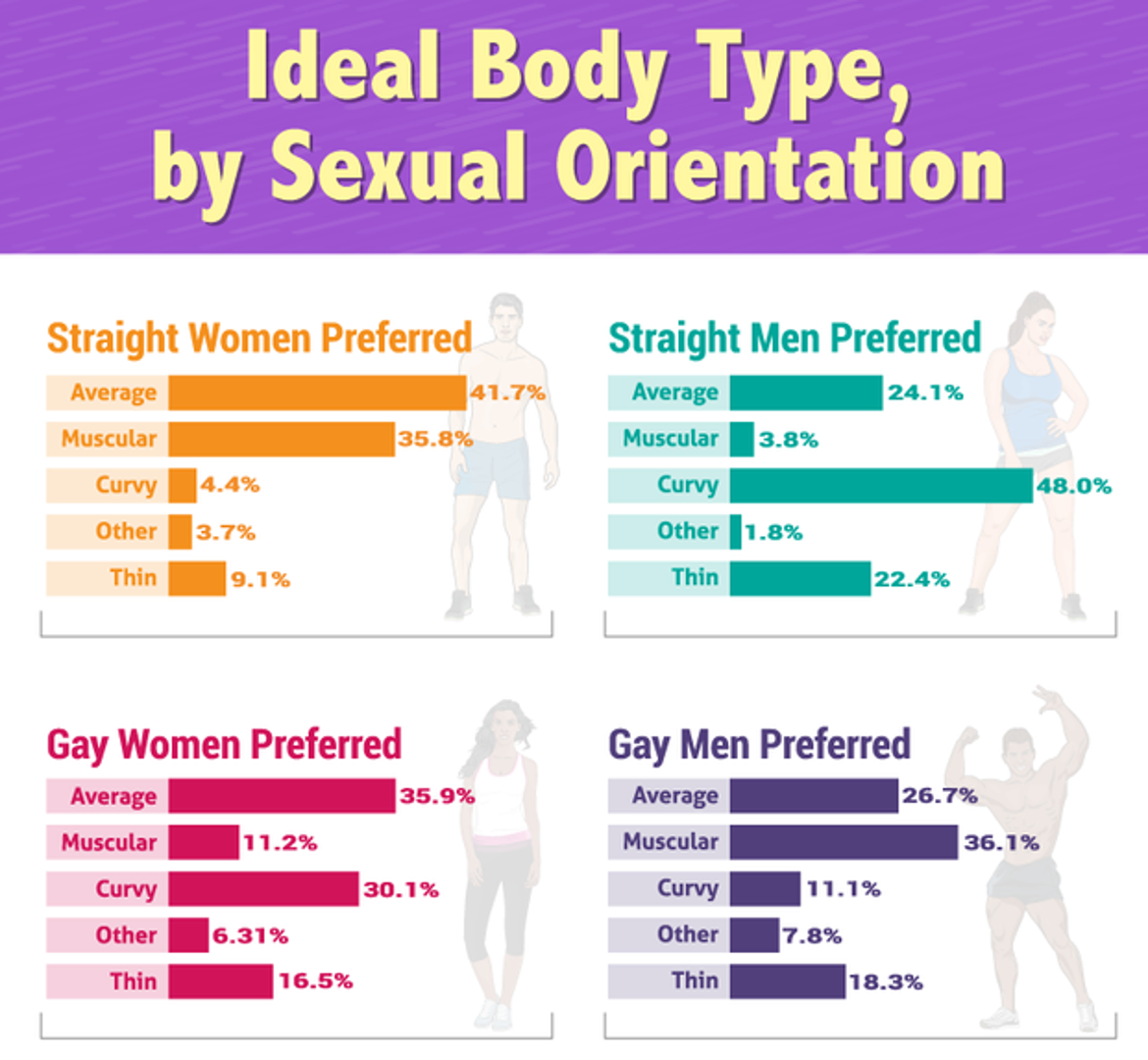 Ispostavilo se tako da muškarci preferiraju žene s oblinama i trbuščićem, iako one često misle da je suprotno. Mišićavo tijelo kod žena sviđa se tek 3,8 posto muškaraca, prosječno 24,1 posto, a mršaviju građu privlačnom smatra 22,4.