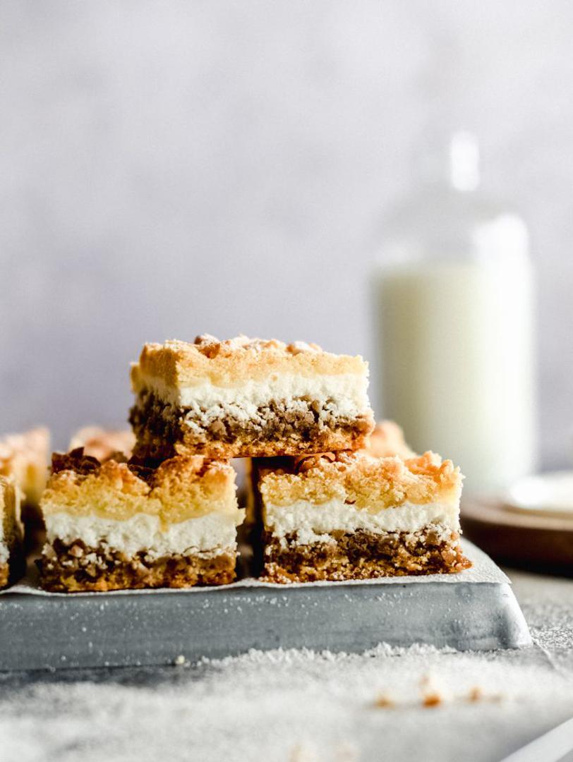 Za nadjev od sira mladi sir ocijedite od viška vode pa ga izradite mikserom sa šećerom i vanilijom. Bjelanjke s prstohvatom soli istucite u snijeg, pazite da snijeg ne bude previše čvrst kako bi ga lagano umiješali u sir. Pomoću špatule bjelanjke sjedinite sa sirom i šećerom. Nadjev ravnomjerno rasporedite po nadjevu od oraha. Poravnajte površinu pomoću špatule.