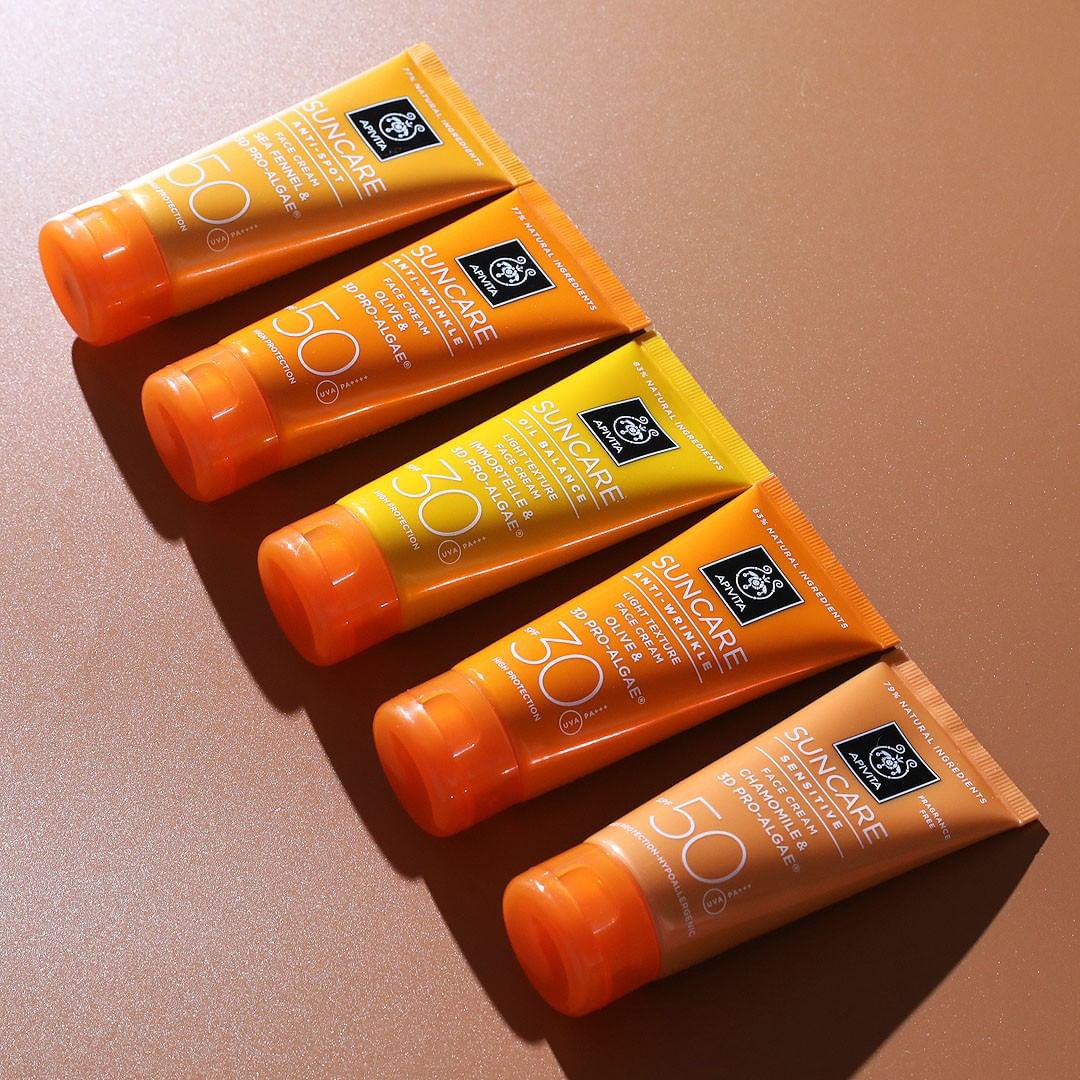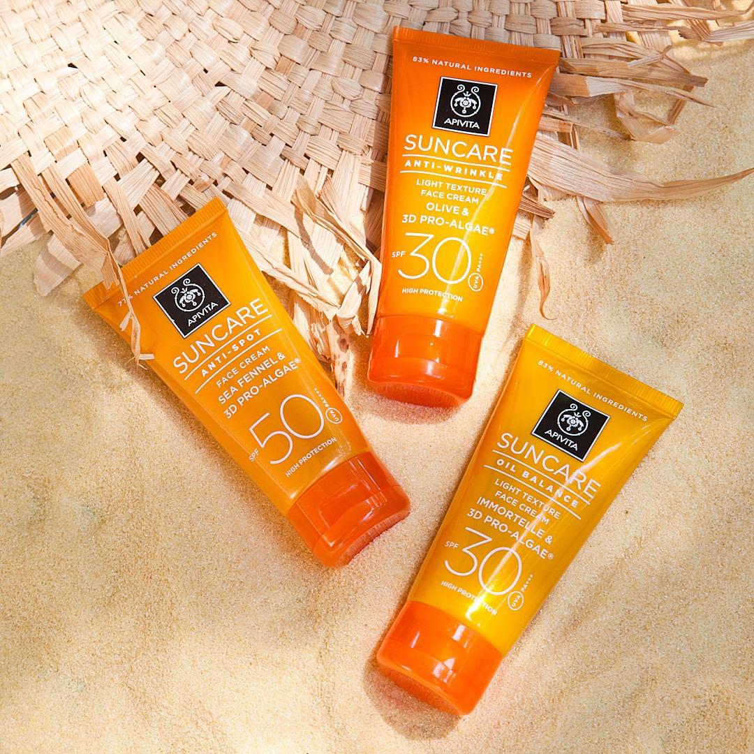 Prilikom izlaganja suncu, posebnu pozornost treba staviti na zaštitu lica. APIVITA proizvodi namijenjeni zaštiti lica sastoje se od čak sedam krema i zadovoljit će različite tipove kože. Bilo da se radi o matirajućoj kremi lagane teksture sa smiljem sa zaštitnim faktorom SPF 30 ili kremi protiv hiperpigmentacije u boji s morskim komoračem sa zaštitnim faktorom SPF 50 ili pak najnovijem proizvodu - kremi za osjetljivu kožu lica sa zaštitnim faktorom SPF50, izlaganje suncu postaje bezbrižno uz APIVITA liniju za lice. Svi proizvodi iz APIVITA linije za sunčanje namijenjeni zaštiti lica obogaćeni su i 3D PRO-ALGAE® kompleksom.