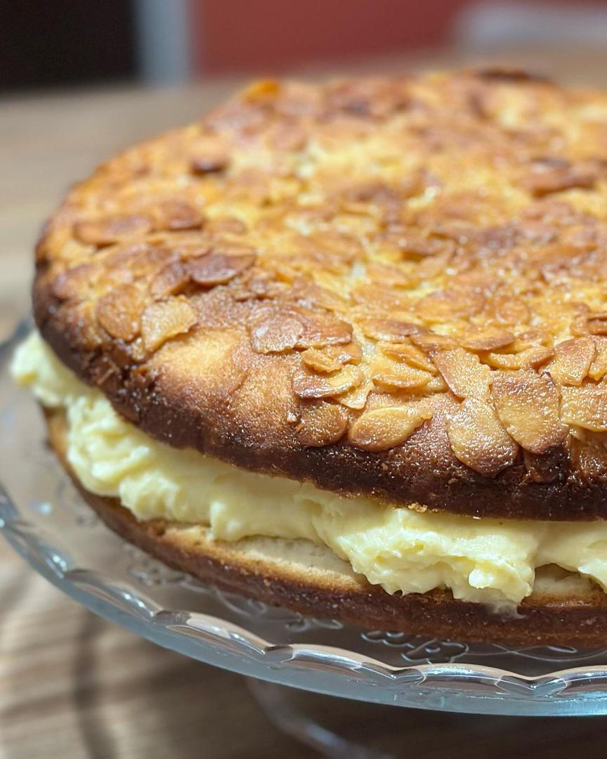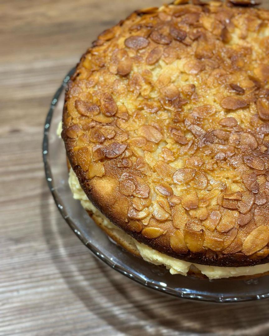 Sve sastojke za tijesto umijesite i pustite da se digne, po mogućnosti dva puta. Bit će bolje ako su svi sastojci sobne temperature ili topli. Želite li ubrzati postupak dizanja, pokrivenu zdjelu s tijestom ubacite u pećnicu ugrijanu na 50 °C. Zatim tijesto razvaljajte u željeni oblik na nekih 1,5 cm debljine. Pokrijte i pustite da se digne dok pripremate nadjev. Za premaz u tavi ili posudi otopite sve sastojke osim badema i kuhajte na laganoj vatri pa kad se malo zgusne i postane glatko dodajte bademe i sve sjedinite. To rasporedite preko tijesta, pažljivo da se tijesto ne spusti jer se u međuvremenu trebalo dići. Pecite na 180 °C, 25-30 minuta. Pečeni kolač oprezno izvadite iz kalupa i ohladite.