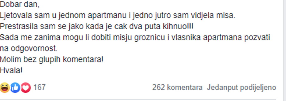 Jedna je žena u grupi Apartmani Hrvatska napisala kako je u apartmanu pronašla miša koji je čak i kihnuo, a komentari na objavu su urnebesni.
