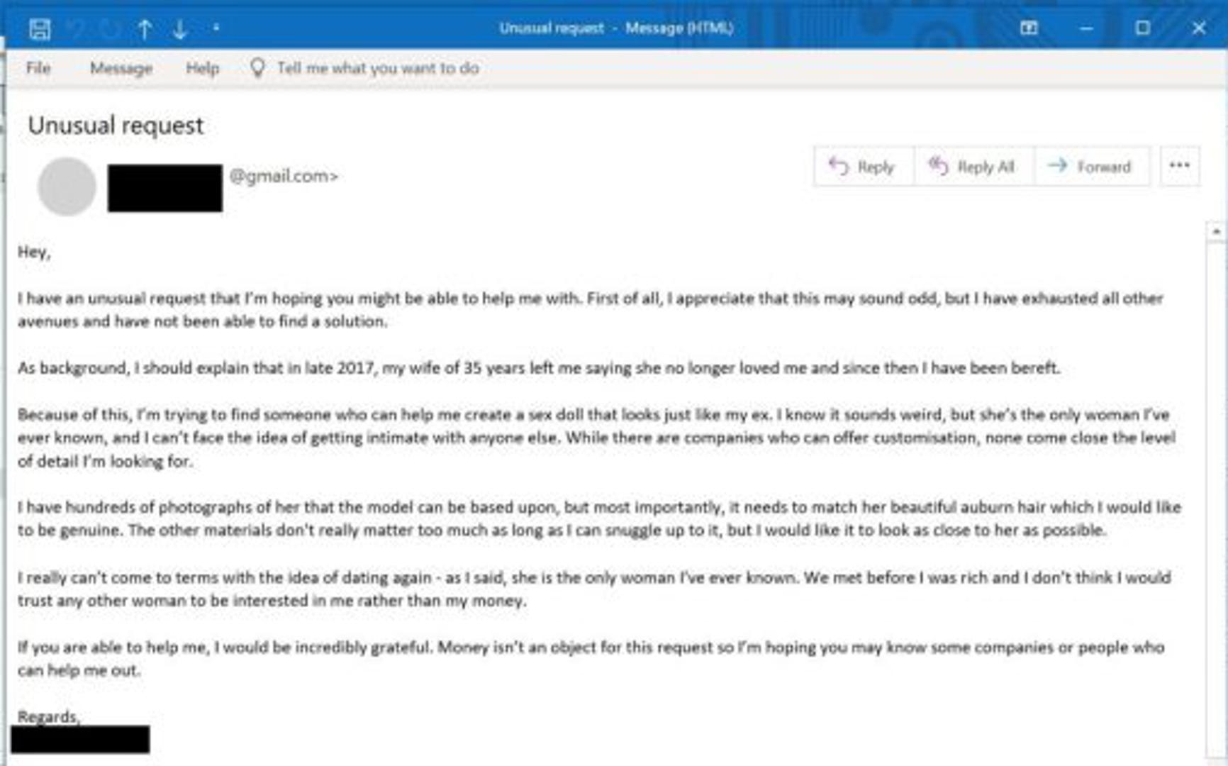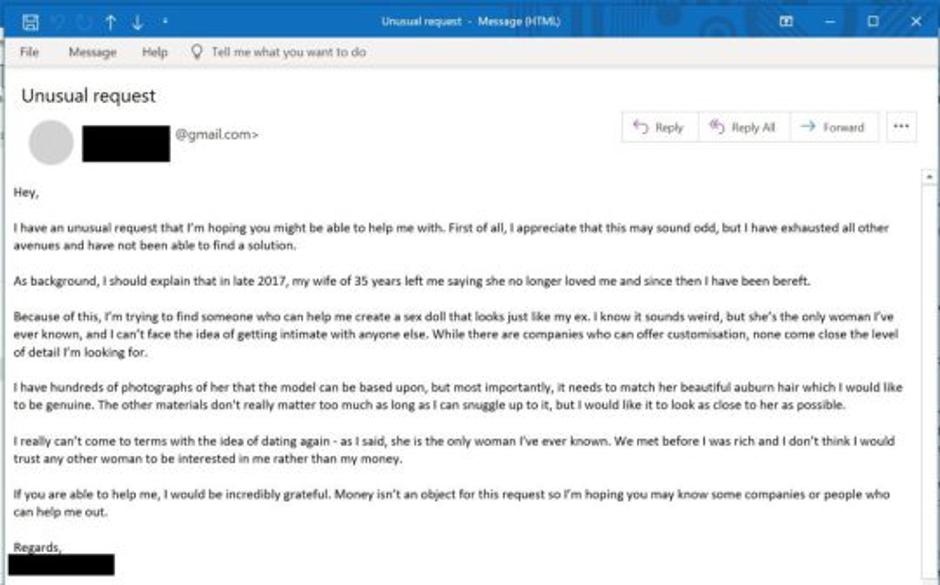 Supruga ga je odlučila ostaviti krajem 2017. godine, jer ga više nije voljela, kako je pojasnio u svom zahtjevu. Dodao je kako je pokušavao na razne načine boriti se s tugom i usamljenošću koju je osjetio nakon supruzinog odlaska, no ono što mu je palo na pamet, mnoge može lako sablazniti. Poželio je imati seks lutku identičnog izgleda njegove bivše supruge.
