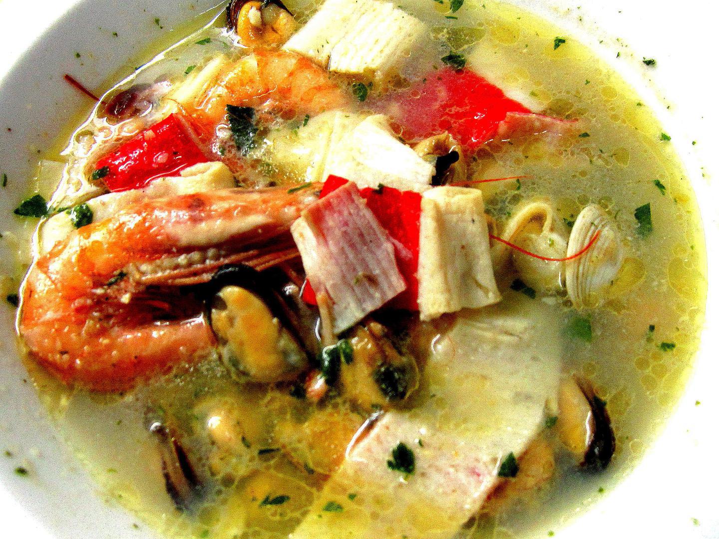 U 1 ½ hladne vode ubacite 1 sitno sjeckanu kapulu, 4 režnja česnjaka, 1 crvenu papriku sječenu na kocke, 1 list lovora i 1 kg miješane ribe, najbolje 2 očišćena manja brancina Cromaris i 1 očišćenu ugorovu glavu od 20 dag. Malo posolite i popaprite, podlijte sa 1/2 dl maslinova ulja i pustite da kuha oko 25 min., sve dok juha i riba na budu gotove. Tada procijedite juhu u drugu posudu, očistite meso mola ili oslića od drača i kostiju, vratite skuhano povrće u juhu pa dodajte ½ kg većih kozica i po 15 dag dagnji i kućica. Kad se školjke otvore, ubacite 1 žlicu maslaca, pokapajte juhu sa par kapi limuna, ukrasite sjeckanim petrusimulom i služite vruće. Po mletačkom receptu.