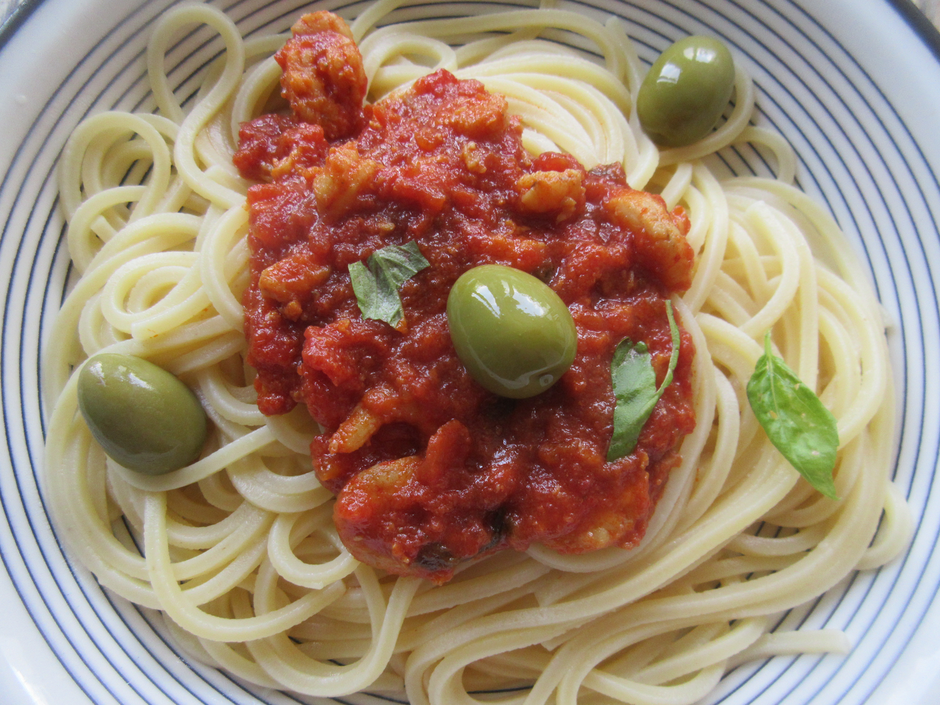 Na 1 dl maslinova ulja zazlatite 1 manju sjeckanu kapulu, 1 zgnječeni režanj češnjaka, pa dodajte ½ l sjeckanih rajčica te 1 sitno sjeckani ljuti svježi crveni feferon i 1 žličicu krupne morske soli. Skuhajte u kipućoj posoljenoj vodi 40 dag špageta pa procijedite i stavite tjesteninu u zdjelu. Tada u već gotovu šalšicu ubacite 20 dag očišćenih repova od malih kozica, sve promiješajte i pridodajte još vrućim špagetima i služite odmah.