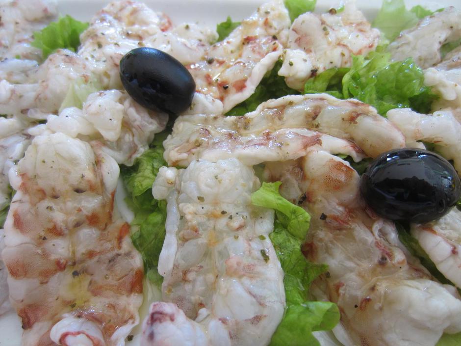 Očistite od oklopa i repova oko ¾ kg velikih tigrastih kozica, pa meso iz repa malo pokapajte sokom od po 1/2 limuna i naranče, posolite i popaprite pa ostavite desetak minuta u hladioniku. Prije služenja podlijte sa 1 dl djevičanskog maslinova ulja i služite odmah.