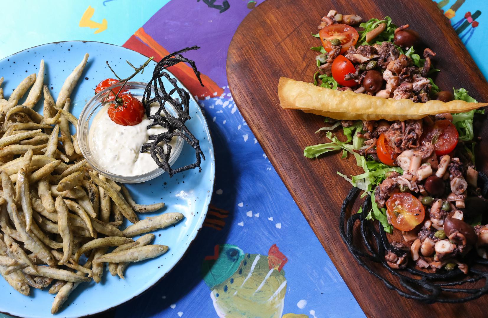 U Ribice i tri točkice svaki dan stiže riba. Srdele iz Rovinja, gavuni s Raba, tune iz Zadra, grdobina s Jabuke, škampi iz Velebitskog kanala, kozji i kravlji sir iz Istre, pršut – iz Drniša.