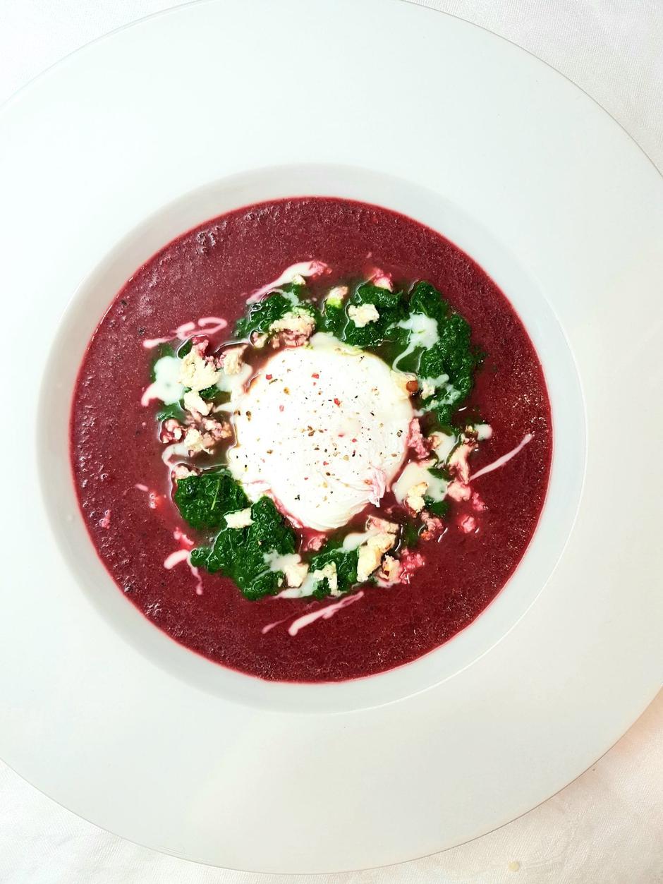 Prelijte maslinovim uljem, posolite i stavite u prethodno zagrijanu pećnicu da se peče oko 30 minuta. Celer i luk narežite na manje komade pa stavite u lonac s malo maslinova ulja, lovorom i malo soli da se pirja desetak minuta. Pred kraj ubacite 1 češanj češnjaka narezan na listiće. Dodajte vodu od kuhanja raštike da prekrije povrće. Posolite, dodajte malo papra pa pustite da se kuha dok povrće ne omekša. Kada je cikla pečena, ubacite ju u juhu, neka se još kratko kuha. Kada je povrće omekšalo, štapnim mikserom ga smiksajte u krem juhu. Po potrebi dodajte još vode i začina. Servirajte u tanjur juhu pa ukrasite pestom i izmrvljenim dimljenim mekanim kravljim sirom ili feta sirom. Ako želite da juha bude cjeloviti obrok, poširajte jaje pa ga stavite u sredinu.