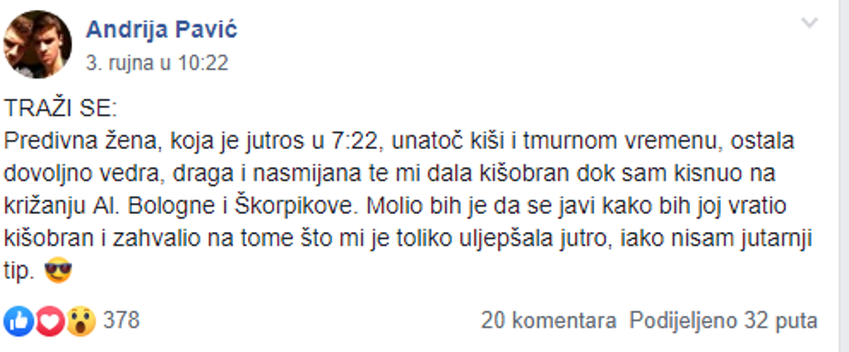 U Facebook grupi "Gajnice jučer danas sutra" Andrija je napisao sljedeće: "Traži se: Predivna žena, koja je jutros u 7:22, unatoč kiši i tmurnom vremenu, ostala dovoljno vedra, draga i nasmijana te mi dala kišobran dok sam kisnuo na križanju Av. Bologne i Škorpikove. Molio bih je da se javi kako bih joj vratio kišobran i zahvalio na tome što mi je toliko uljepšala jutro, iako nisam jutarnji tip”