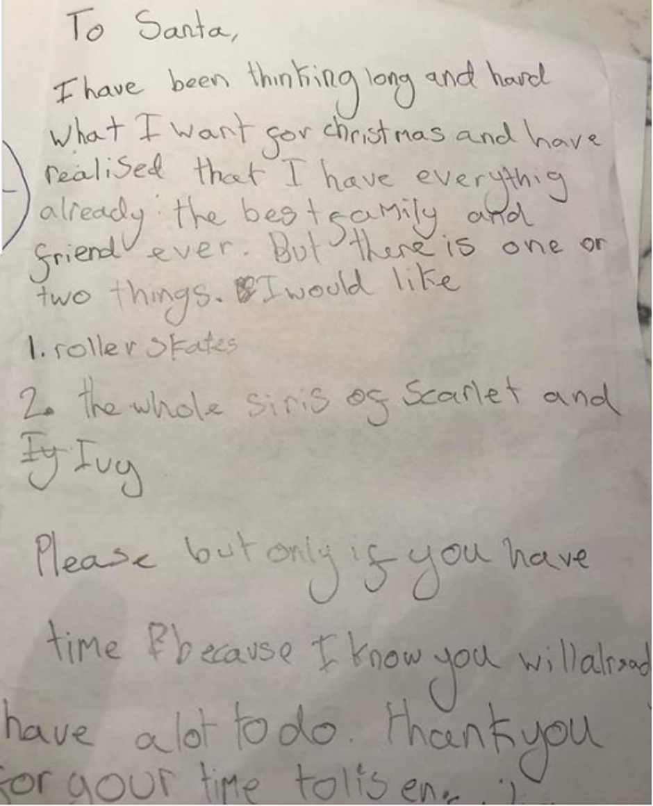 Njezino pismo: "Djedice, dugo sam i puno razmišljala što želim za Božić. Shvatila sam da imam sve - najbolju obitelj i prijatelje. Ima jedna ili dvije stvari koje želim, ali samo ako imaš vremena jer znam da imaš puno posla. Hvala ti na izdvojenom vremenu."