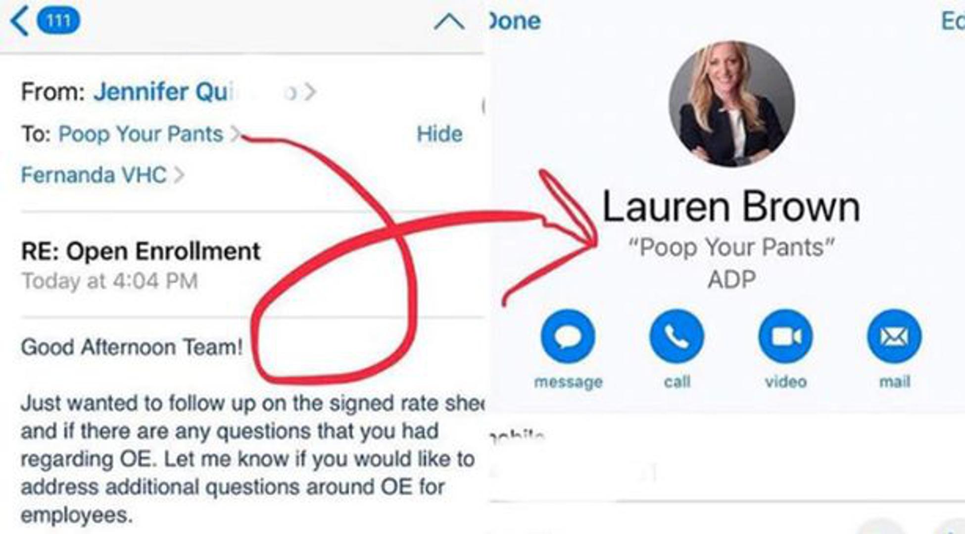 Tako je mama dobila novo ime na službenom e-mailu i to "Poop Your Pants", odnosno "Pokakala sam se u gaće", a na LinkedInu je napisala: "Nisam primijetila ovu malu promjenu sve dok se nišam pronašla u kopiji maila. Prvo nisam ni shvatila da je to moj e-mail i mislila sam kako je to neprofesionalno, a onda sam vidjela da iza te adrese stoji moja fotografija. Dragi zaposleni roditelji, neka vam ovo bude pouka. "