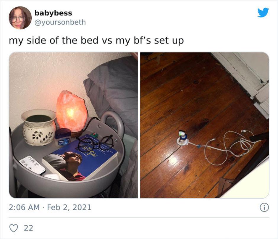 I dok Hanny baš poput drugih žena na noćni ormarić odlaže neke stvari koje joj donose mir prije spavanja poput knjige, biljke, svijeće, krema... Kod njezinog partnera je potpuno drugačija priča - on ni nema noćni ormarić, a prostor kraj kreveta služi mu za bočicu omiljenog napitka i punjač za mobitel, prenosi BoredPanda.