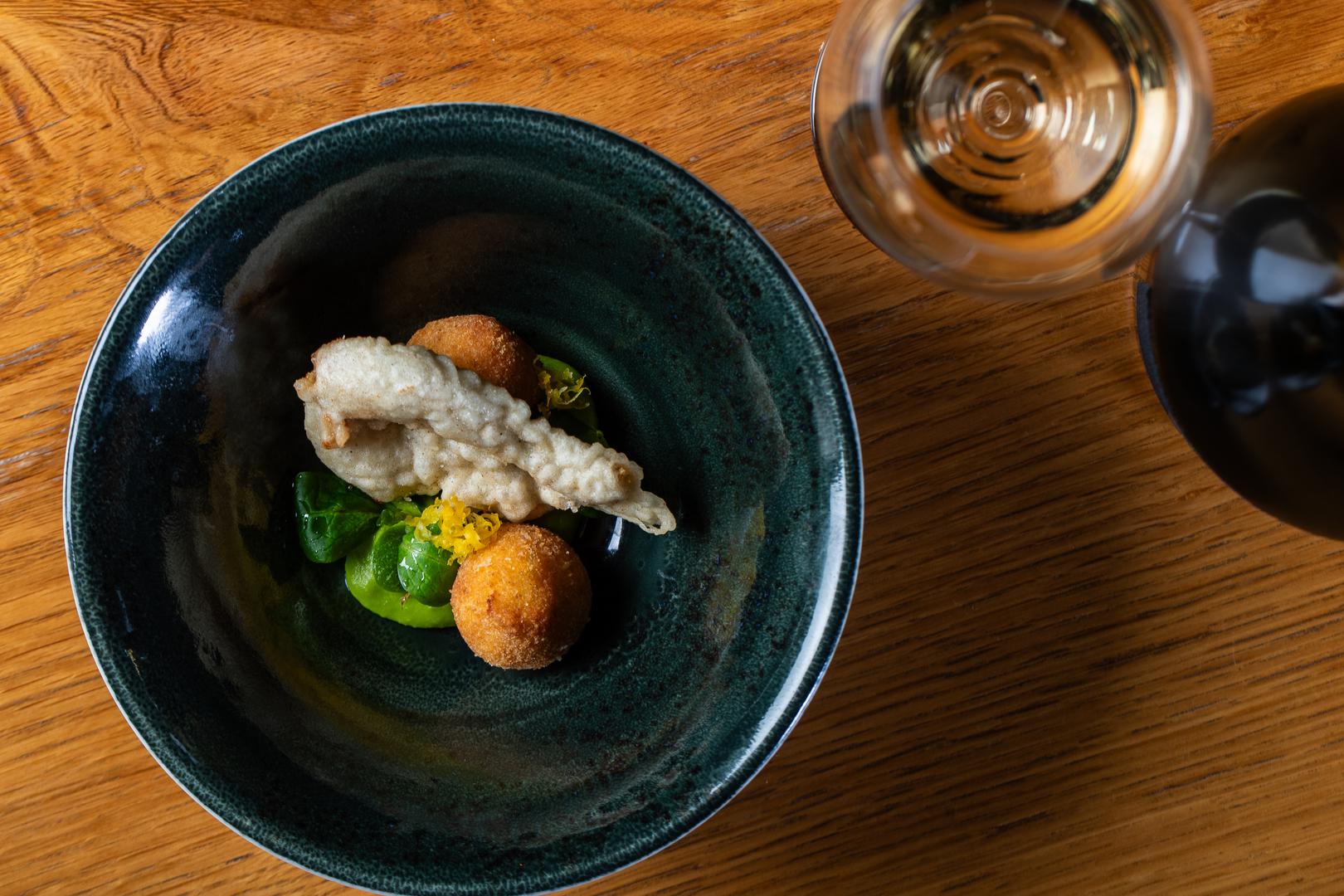 Večera u restoranu oblikovanom doista poput čarde, ali samo u osnovi jer je riječ o prostorom i opremljenošću izdašnom mjestu, počela je prvom kreacijom Kristijana Kišpala, mladog chefa restorana, domaćom focaccijom s mirodijama, paštetom od divljači i fritiranom rukolom, par je bio Graševina Zlatno brdo 2024. koju ćete prepoznati po bijeloj etiketi. Već se tu osjetila znatno veća ambicija restorana na Biljskom jezeru čiji je izdašno uređen interijer te večeri bio pun. Nakon toga, uslijedio je citrusni rižoto s poširanim filetima smuđa i pjenicom od mente, a zatim predjelo od žabljeg kraka u tempuri na kremi od graška s kroketima od svježeg sira. Glavno jelo činila je zaista izvrsna sous vide teleća koljenica s pireom od pečene paprike i umakom s kojim je i poslužen Čingi Lingi Cuvée.