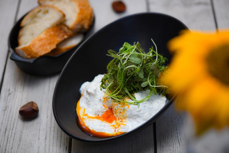 U posudi pomiješajte grčki jogurt, svježi kravlji sir, sitno nasjeckano začinsko bilje te začine (količina po ukusu) i jednu žličicu dijon senfa. Jaja poširajte te preko njih prelijte aromatizirani jogurt. U posudi rastopite 50 g maslaca te u njega umiješajte mljevenu slatku (ili po želji ljutu) crvenu papriku. Ovo fino začinjeno jelo poslužite uz tostirani kruh i svježu salatu po ukusu.