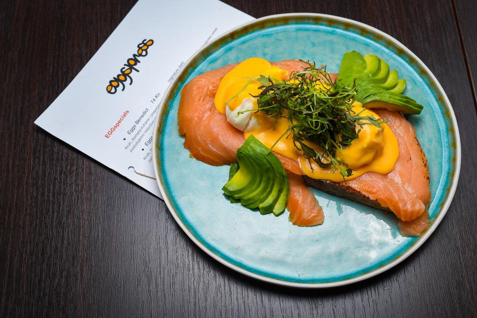 Jaja ulijte u vruću, ali ne ključalu vodu i lagano ih poširajte, pazeći da vam žumanjak ostane tekući. Zatim pripremite holandski umak na isti način kako je objašnjeno u prethodnom receptu. Kad ste gotovi, na tostirani kruh stavite 100 g dimljenog lososa, poslažite 3 poširana jaja te preko njih prelijte topli holandski umak. Ukrasite mizuna salatom, a kao zamjena može poslužiti i rikula. Dodatno ukrasite jelo s nekoliko komadića fino narezanog avokada.