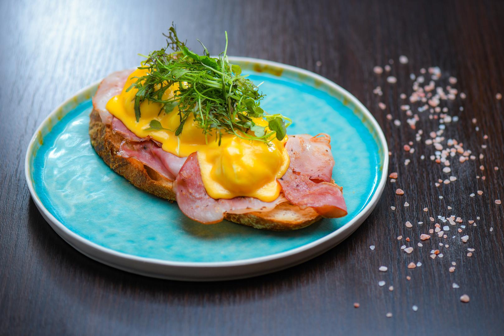 Jaja ulijte u vruću, ali ne ključalu vodu i lagano ih poširajte, pazeći da vam žumanjak ostane tekući. Na pari razmutite 2 žumanjka mutilicom i polagano ima dodajte 70 g rastopljenog maslaca. Lagano miješajte da biste dobili finu strukturu sličnu majonezi. Pazite pritom da vam se kotlić ne pregrije, jer ćete umjesto holandskog umaka dobiti kajganu. U holandski umak od začina treba staviti samo malo limunova soka, malo senfa i prstohvat soli. Na tostirani kruh stavite 100 g kuhane šunke koju ste prije toga lagano prepekli na tavi, poslažite 3 poširana jaja te preko njih prelijte topli holandski umak. Ukrasite sve japanskom mizuna salatom koja ima fantastičan okus koji prija uz ovo jelo, a izgledat će vrlo lijepo kao dekor.