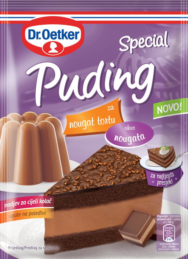 Dr. Oetker pripremio je pravu poslasticu za sve ljubitelje pudinga, torti i kolača – Special Puding za nougat tortu! Postojeći asortiman Special Pudinga nadopunjen je omiljenim i trendi okusom nougata koji će oduševiti raskošnom aromom lješnjaka i svima dobro poznatom Dr. Oetker kvalitetom, sljedeći provjerenu i uspješnu recepturu zbog kojeg su Dr. Oetker Special Pudinzi toliko obožavani među potrošačima.