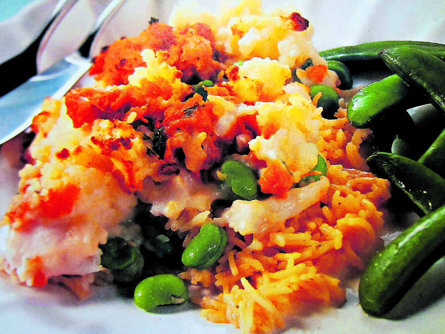 Skuhajte 20 dag basmati riže u ribljem temeljcu. Posebno skuhajte 10 dag boba u osoljenoj vodi, baš kao i 60 dag krumpira izrezanog na manje komade te 25 dag malih američkih rezanaca, može i naših za juhu. Procijedite krumpir i zgnječite u glatku smjesu kojoj dodajte po 1 žlicu sjeckanog peršina i kopra te 1 ½ dl slatkog vrhnja. Oko 70 dag fileta od hame Cromaris u prostranoj tavi kuhajte u 3/4 l vodom razblažena mlijeka u kojem ste rastopili 15 dag maslaca oko 5 minuta. Tada izvadite ribu i narežite je na komade. Na drugoj tavi na 5 dag rastopljenog maslaca zazlatite 2 žlice maslaca pa ga ugustite u bešamel dolijevajući mlijeko u kojem se kuhala riba. Prije služenja rižu zajedno s krumpirom rasporedite po dnu vatrostalnog pladnja i na njih stavite bob i ribu pa sve pokrijte bešamelom. Sve posolite i popaprite te zapecite kratko u pećnici dok jelo ne dobije zlatnu koricu. Tada izvadite i izrežite na komade i rasporedite po tanjurima. Južnjački američki recept iz XIX. stoljeća.