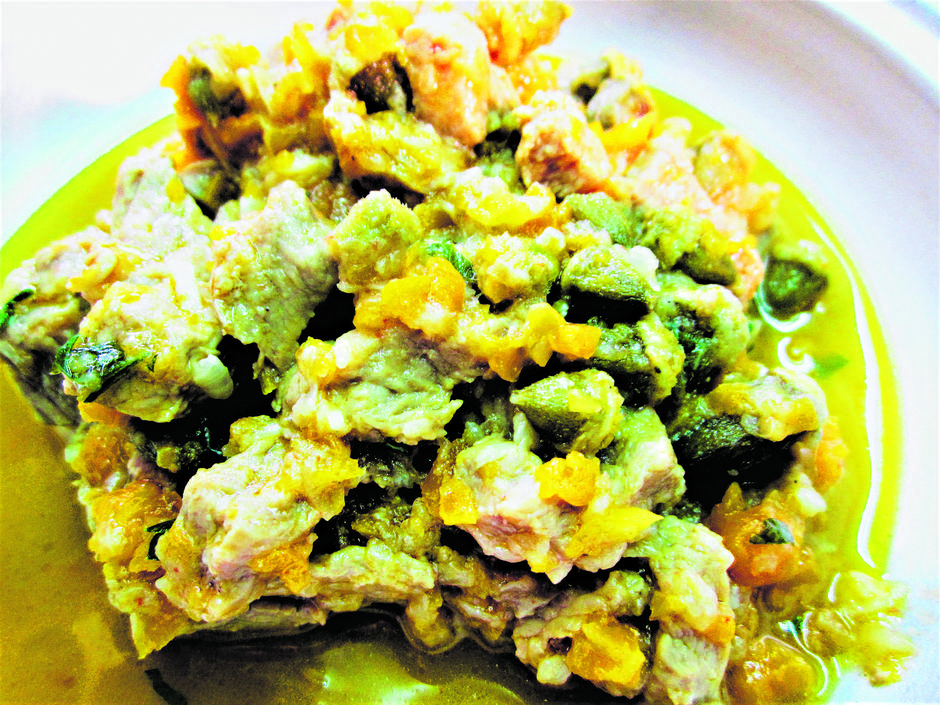 Ispržite pobrašnjene komade mlade kokoši od oko 1 ½ kg pa, kad se ohlade, izvadite sve kosti. U drugoj posudi na ulju od kikirikija prepržite zajedno 15 dag svježe mlade okre ili bamije i 3 sjeckana crvena luka. Sve zajedno, meso i povrće, prebacite u lonac i ulijte ¾ l kokošjeg temeljca, 1 sjeckanu kuhanu mrkvu iz temeljca, posolite i zaljutite s malo mljevenog čilija i pustite da jelo ugusti. Služite preliveno s ½ dl slatkog vrhnja, kao gulaš u zdjelicama. Iz „Praktične južnjačke kuharice s receptima gospođe Hill“, Georgija 1872.