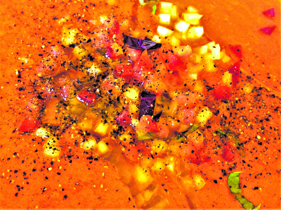U lonac ubacite 4 zdrobljena češnja češnjaka, 1 žlicu soli, ½ žlice mljevene blago ljute paprike, 2 oguljena pomidora, 1 žlicu muštarde i 2 žlice majoneze. Sve sastojke sameljite štapnim mikserom (u doba gospođe Hill usitnjavali bi ih vilicom) dodajući kap po kap 1/2 dl kukuruznog ulja. Tada u smjesu ubacite 1 crvenu španjolsku kapulu sjeckanu na komadiće, 1 crvenu sjeckanu svježu papriku koju ste očistili od sjemenki i 1 sjeckani oguljeni krastavac te 2 velike žlice samljevena mornarskog suhog kolača, može i dvopeka. Podlijte juhu sa ¾ l hladne povrtne juhe i dobro sve opet usitnite mikserom u glatku jušastu smjesu. Služite gaspačo iz Pensacole sa sjeckanim bosiljkom. Floridski recept iz knjige gospođe Hill, kompilacija kultne španjolske juhe.