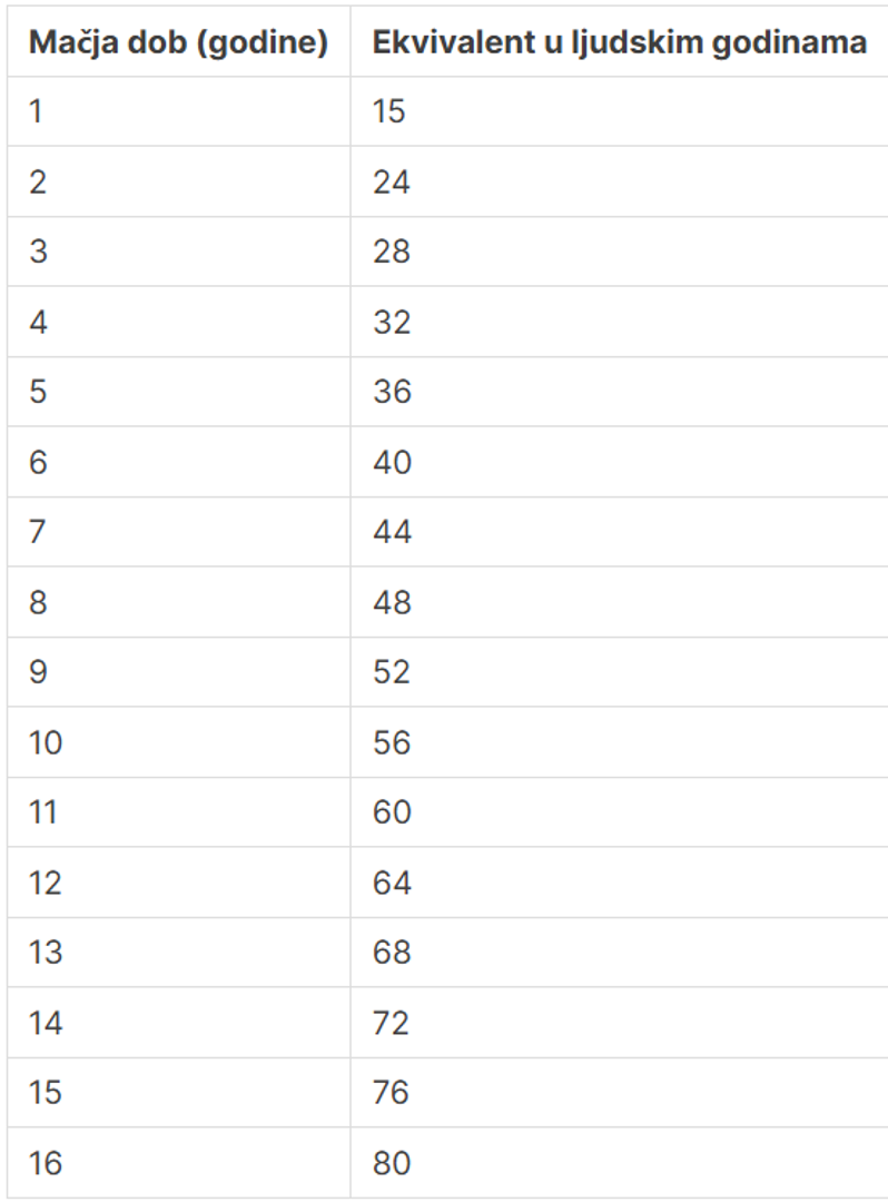 - Mačka stara 3 godine: 24 + 4 = 28 ljudskih godina