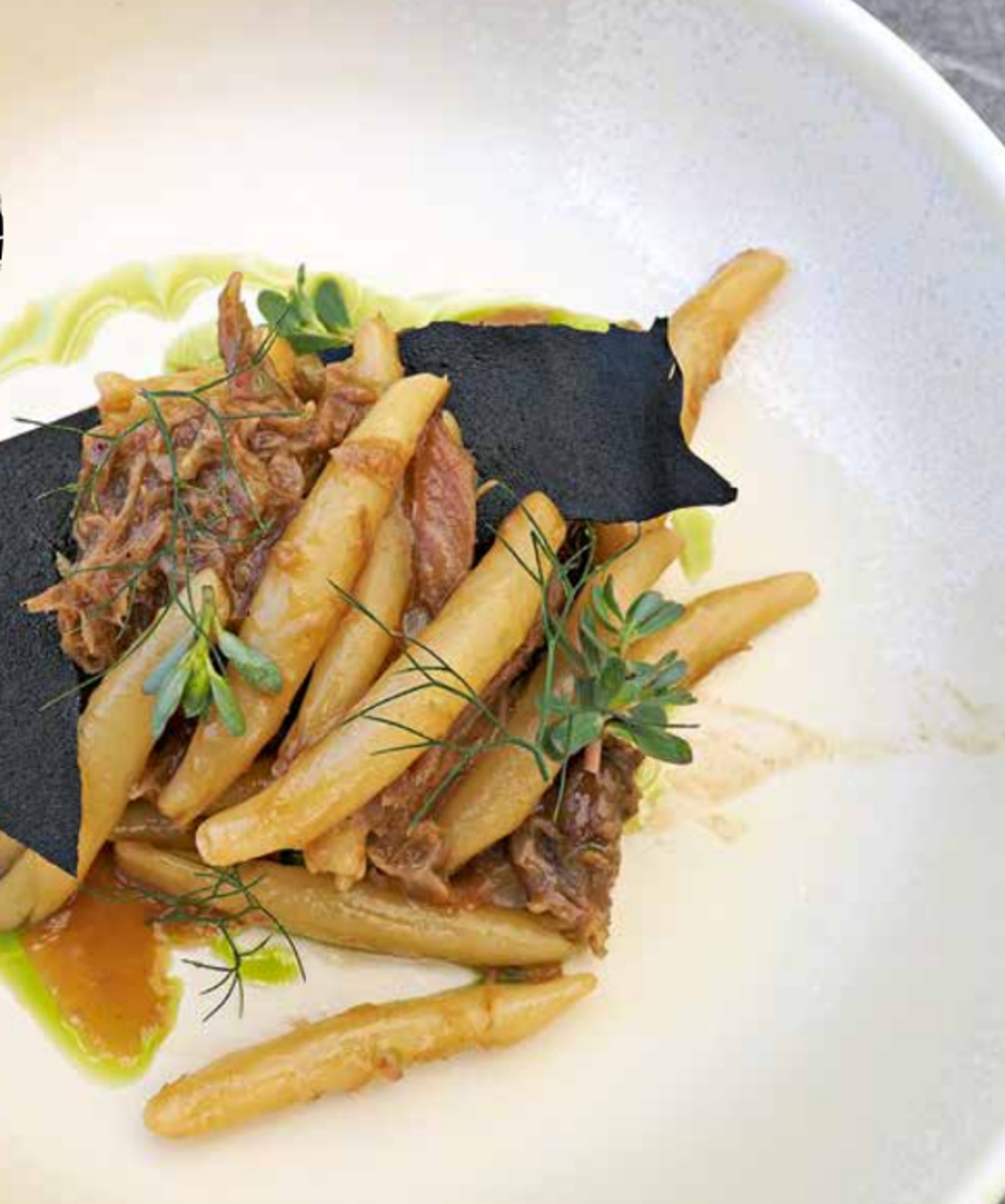 Nakon pečenja meso izvaditi i očistiti od svih kosti, tetiva, žilica i opni. Tekućinu procijediti te iskuhati dok ne dobijemo jaki gusti umak. Skuhati domaće šurlice. Pomiješati ih s umakom i mesom. Završiti s ribanim sirom, maslacem, paprom, nekoliko kapi aceta balzamica.