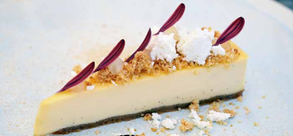 Za crumble od badema pomiješati sve da se dobije pijeskasta tekstura. Raširiti na pleh i peći na 160 stupnjeva, oko 20 minuta. Custard pripremamo tako da prvo grijemo vrhnje i šećer dok ne zavrije. Pomiješati sa žumanjcima, dodati vaniliju, koricu limuna te ostaviti oko sat vremena da se infuzira. Umiksati nekoliko žlica svježe ovčje skute. U kalup promjera 26 cm dobro utisnuti ohlađeni crumble da se napravi čvrsta baza. Preko crumblea preliti aromatizirano vrhnje i žumanjke. Staviti peći u pećnicu, sat i pol na 94 stupnjeva. Princip pečenja je sličan kao za cremme brulee i slične deserte. Izrezati desert te ga poslužiti s još mrvljene svježe ovčje
